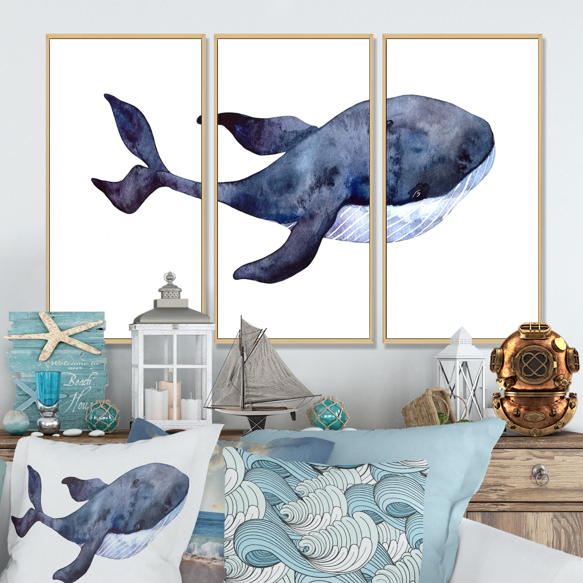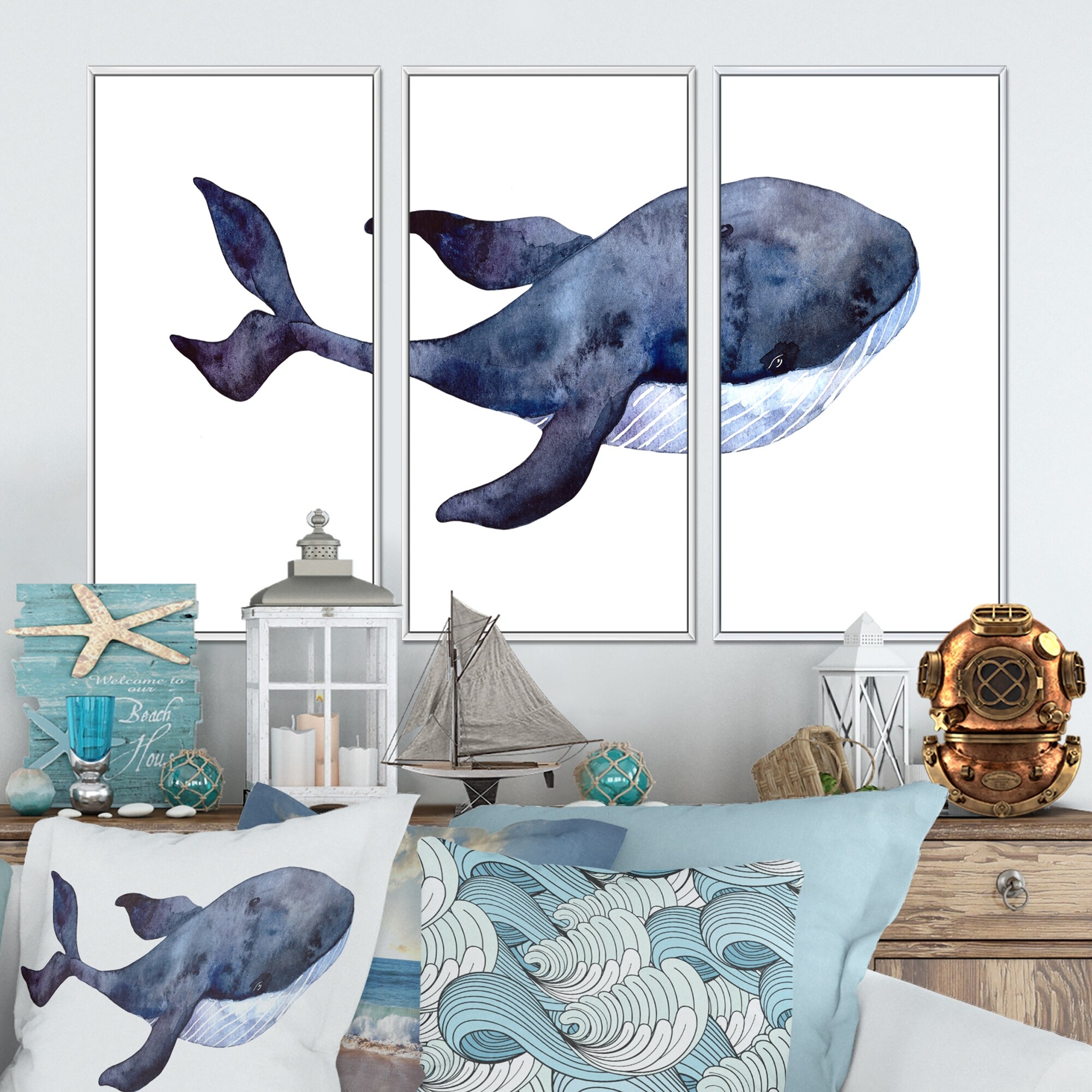 Designart "Blue Whale on White IV" Nautical & Coastal Framed Wall Art Set of 3 - 4 Colors of Frames