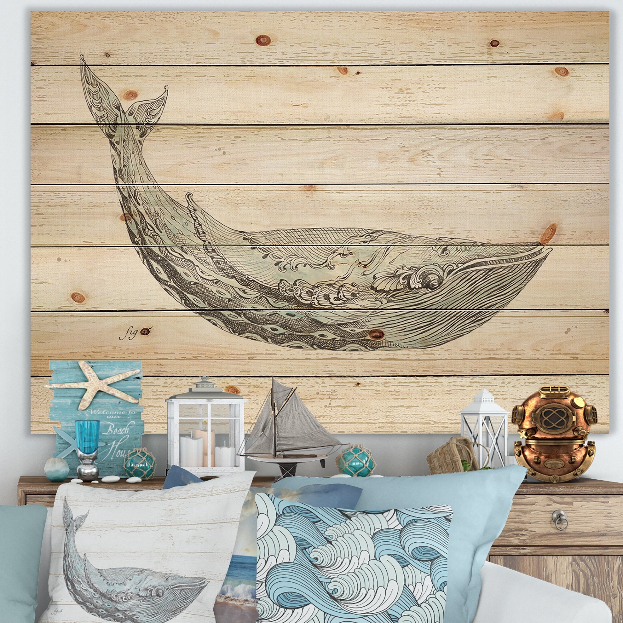 Designart 'Blue Whale Watercolor' Nautical & Coastal Print on Natural Pine Wood - Blue
