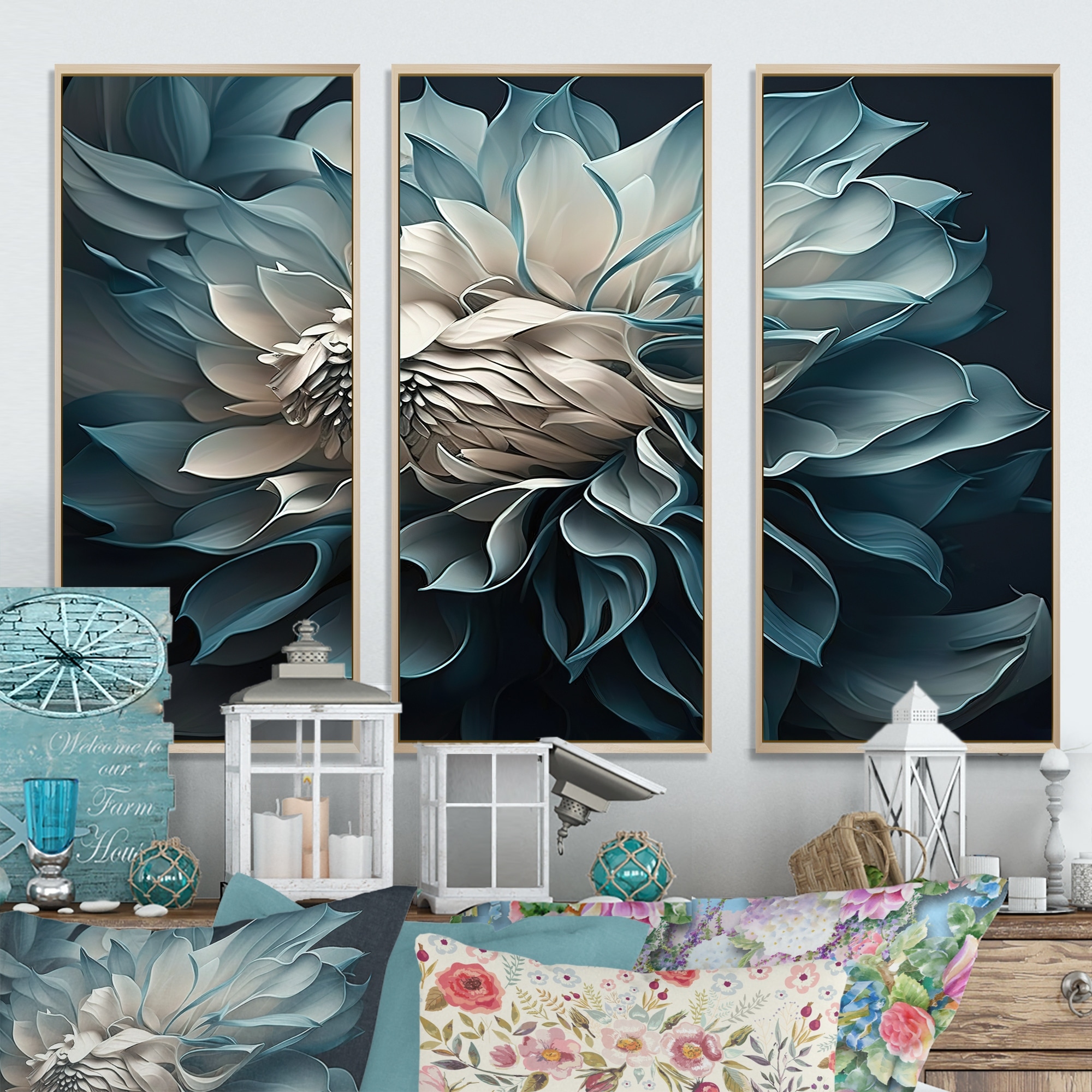 Designart "Blue And White Dahlia Flowers I" Floral Dahlia Framed Canvas Art Print - 3 Panels