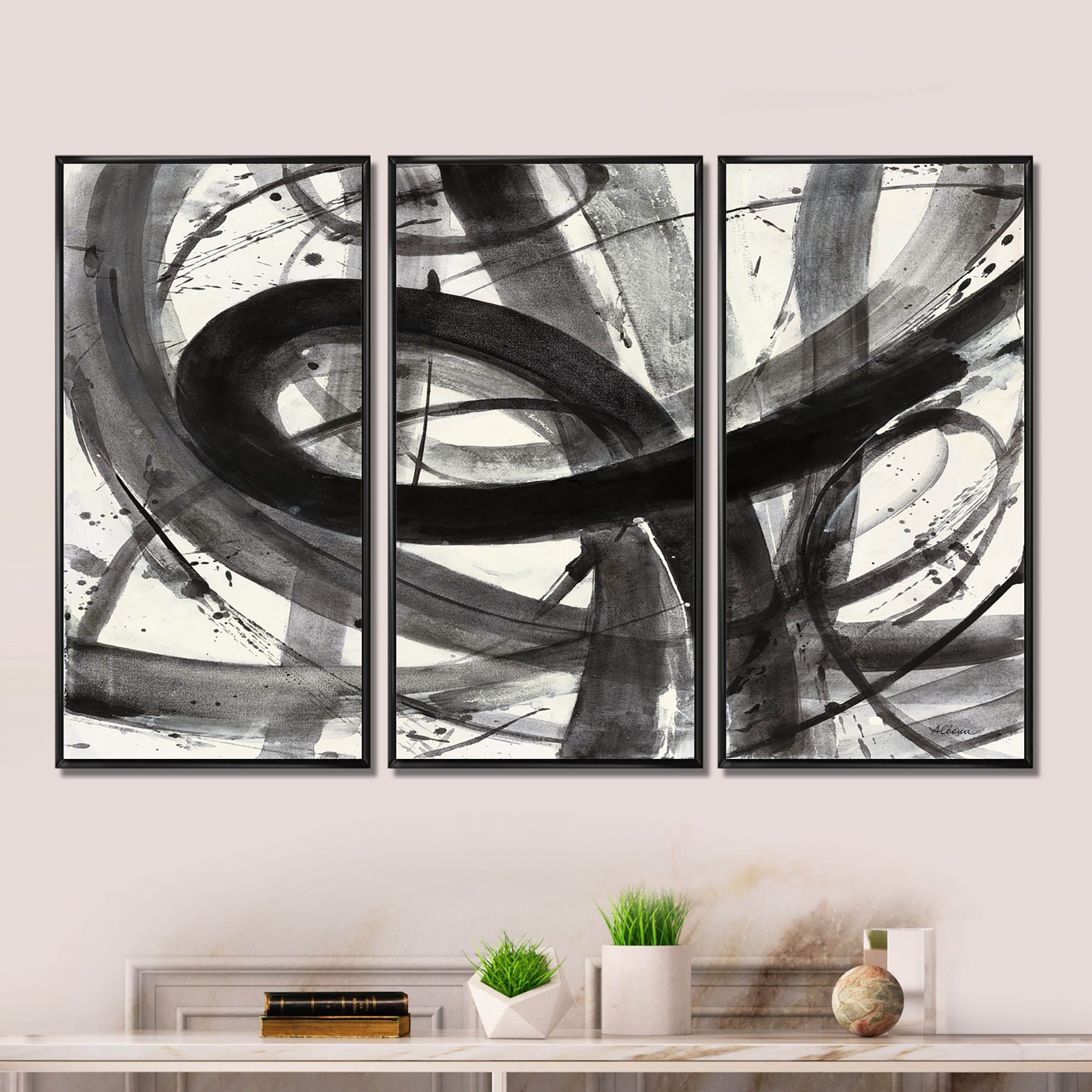 Designart "Black and White Minimalistic Painting" Modern & Contemporary Framed Canvas Wall Art Print - 3 Panels