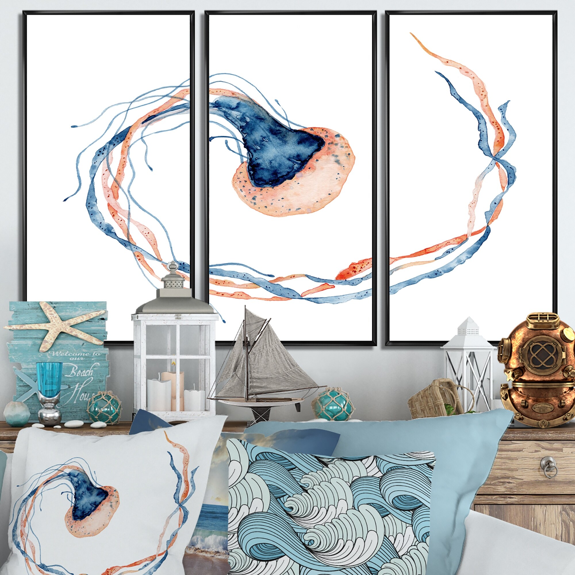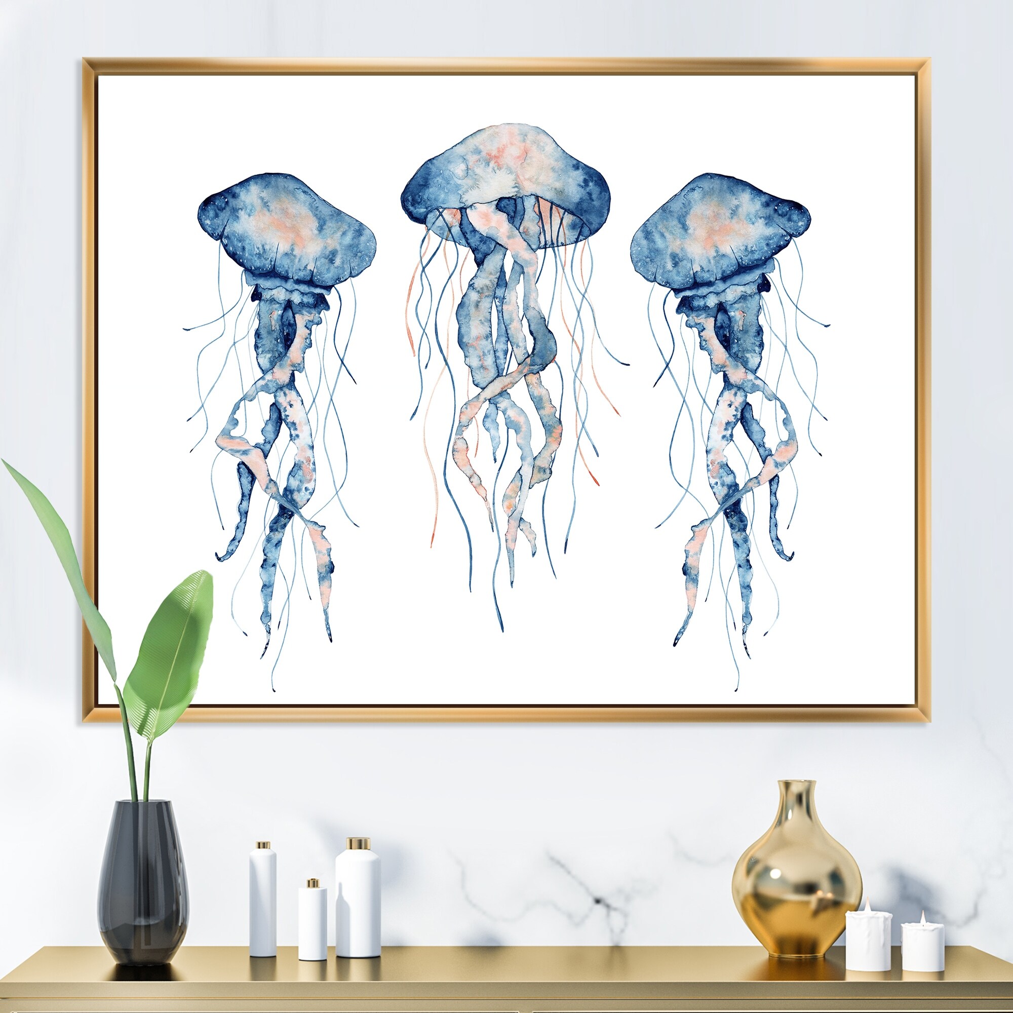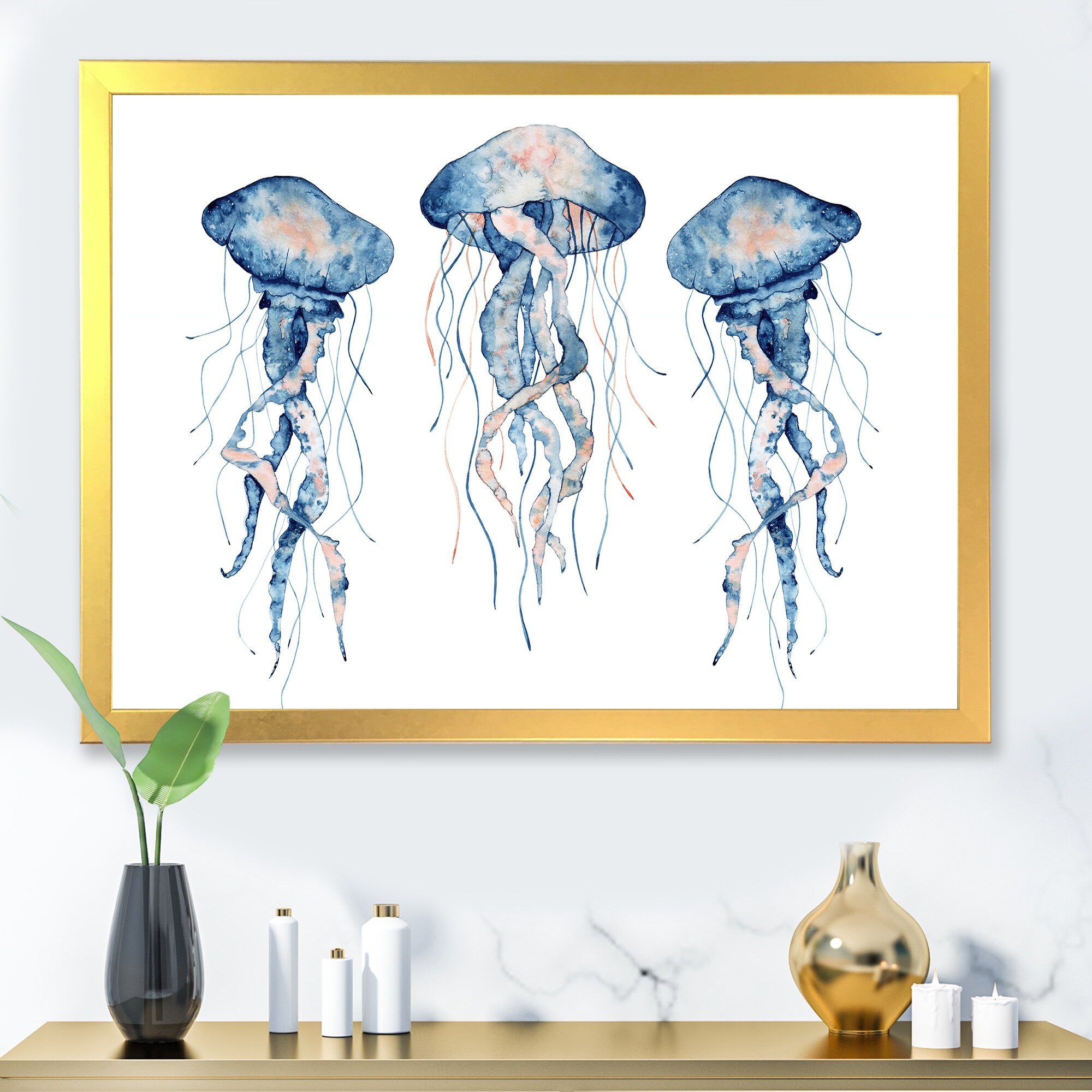 Designart "Painted Medusa on White I" Nautical & Coastal Framed Wall Decor Set of 3 - 4 Colors of Frames