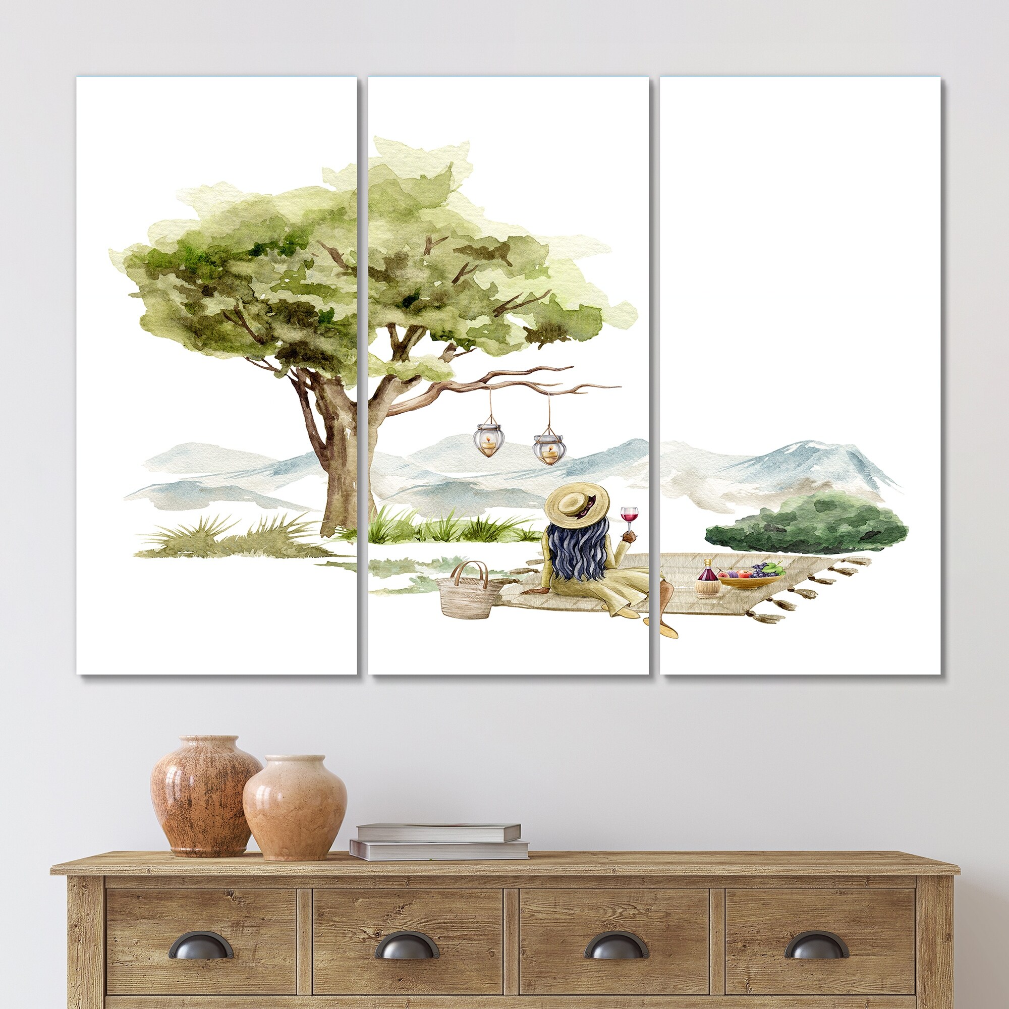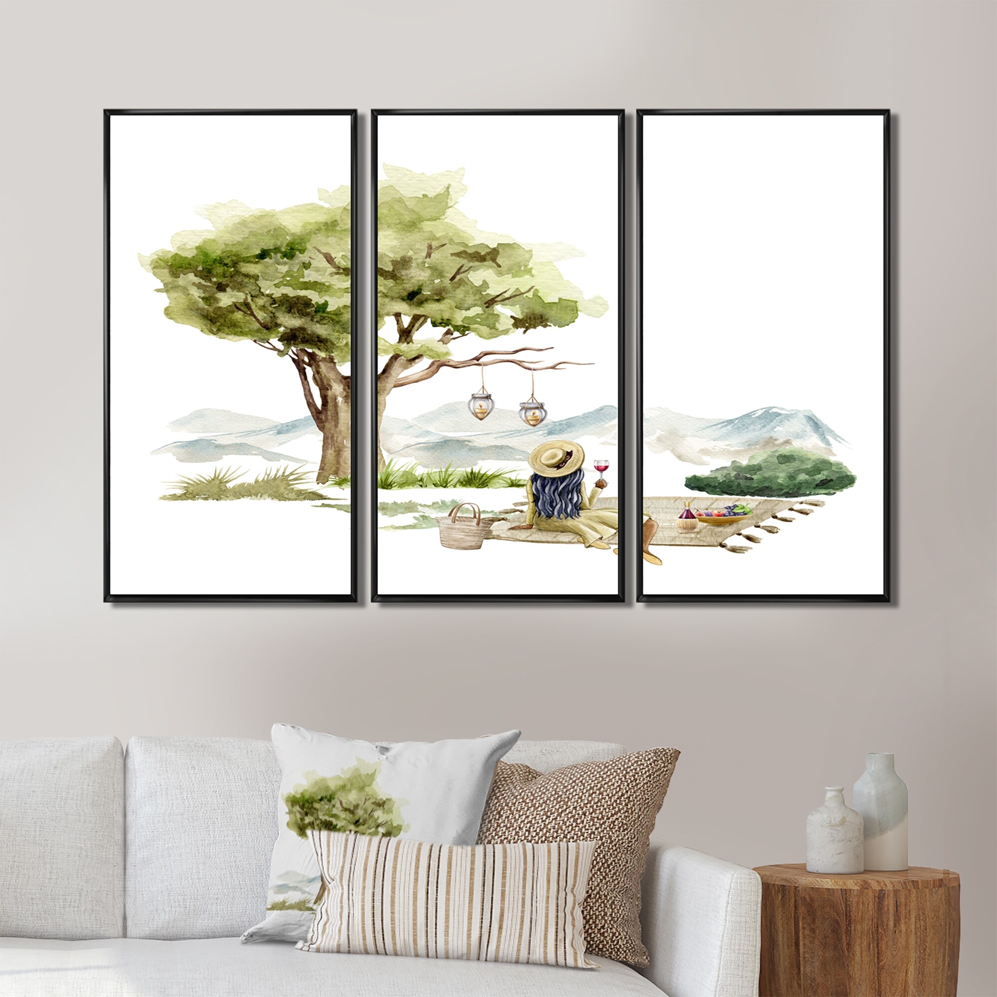 Designart "Young Girl Sitting With A Glass of Wine Under Tree" Country Framed Wall Art Set of 3 - 4 Colors of Frames