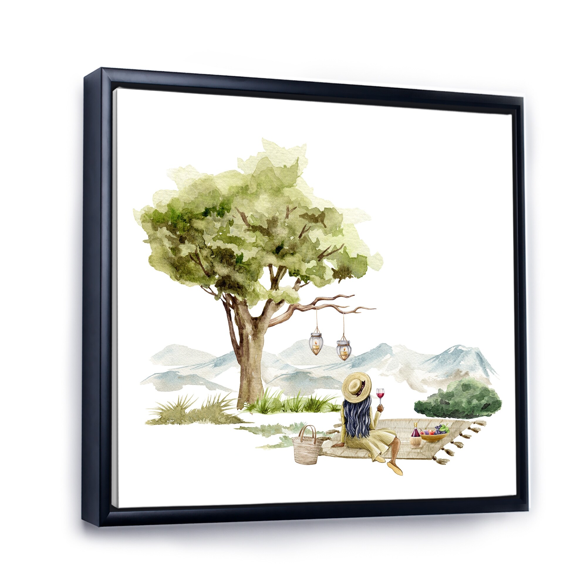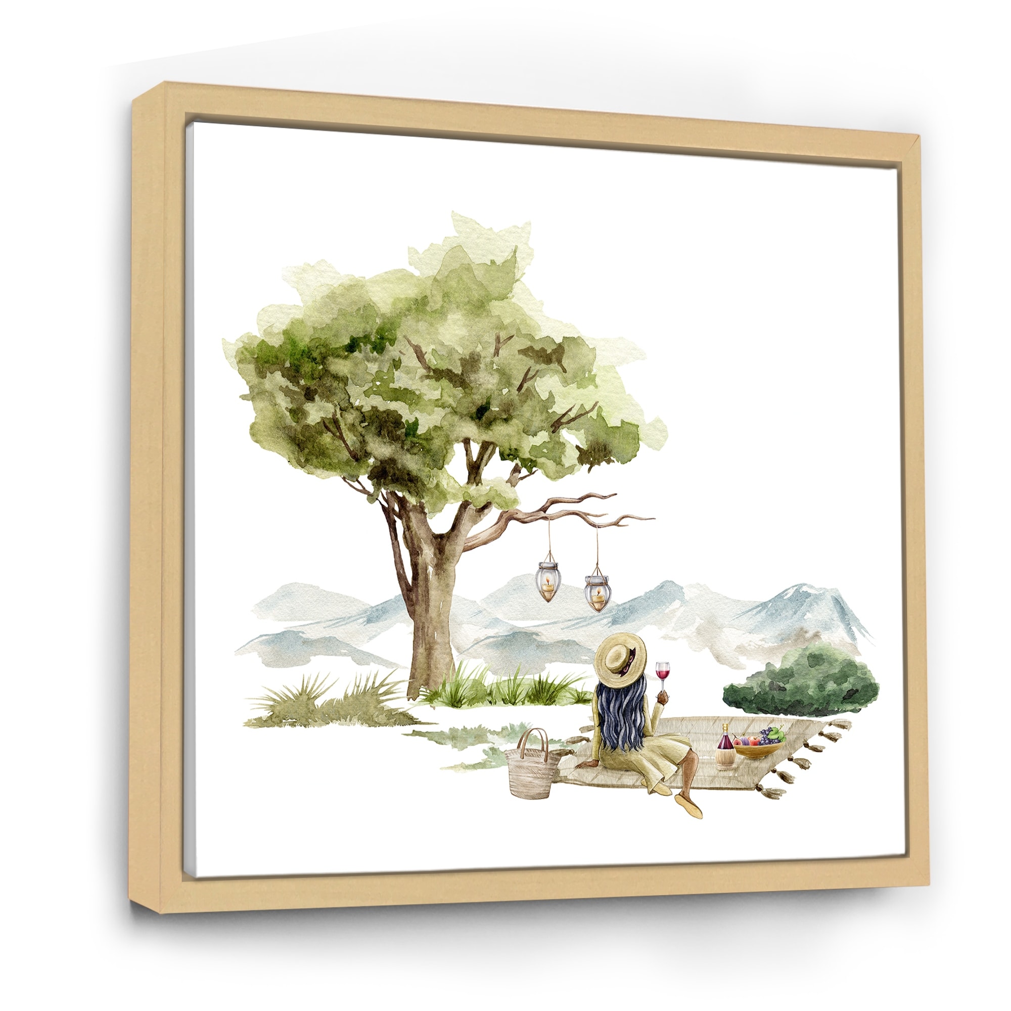Designart "Young Girl Sitting With A Glass of Wine Under Tree" Country Framed Canvas Wall Art Print