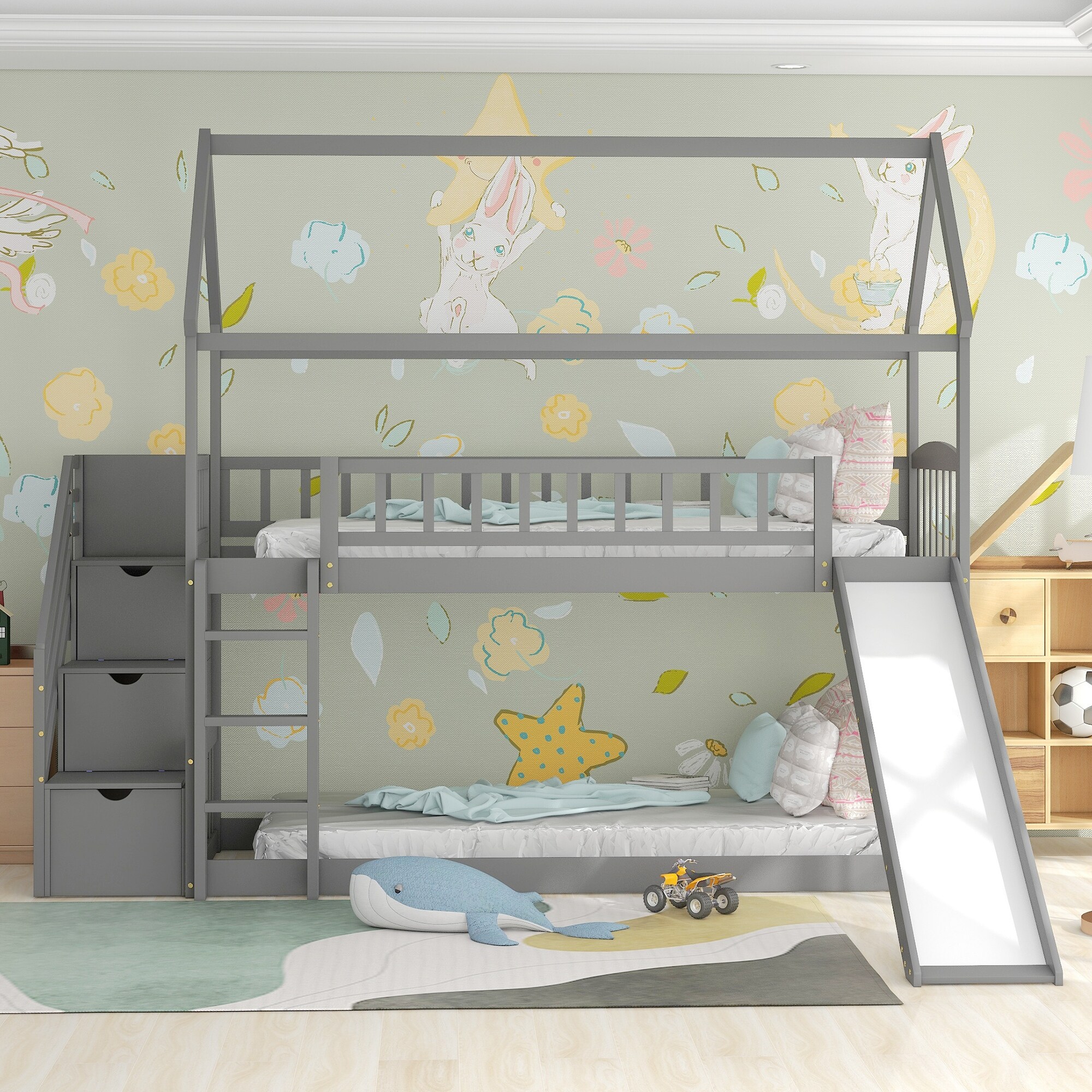 Twin Over Twin Bunk Bed with Drawers and Slide, House Bed with Slide, Solid Pine Legs, Storage Steps and Playhouse Design