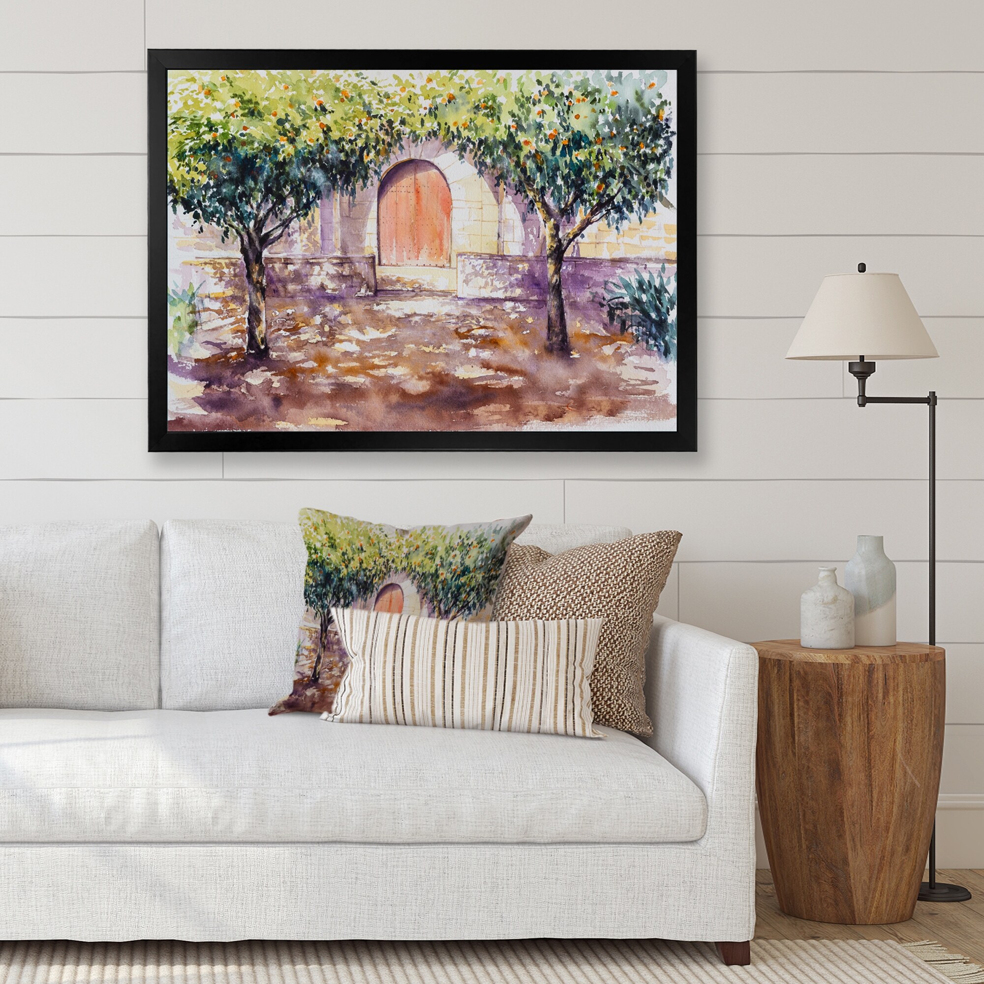 Designart "Backyard Library in Barcelona With Orange Trees" Traditional Framed Art Print