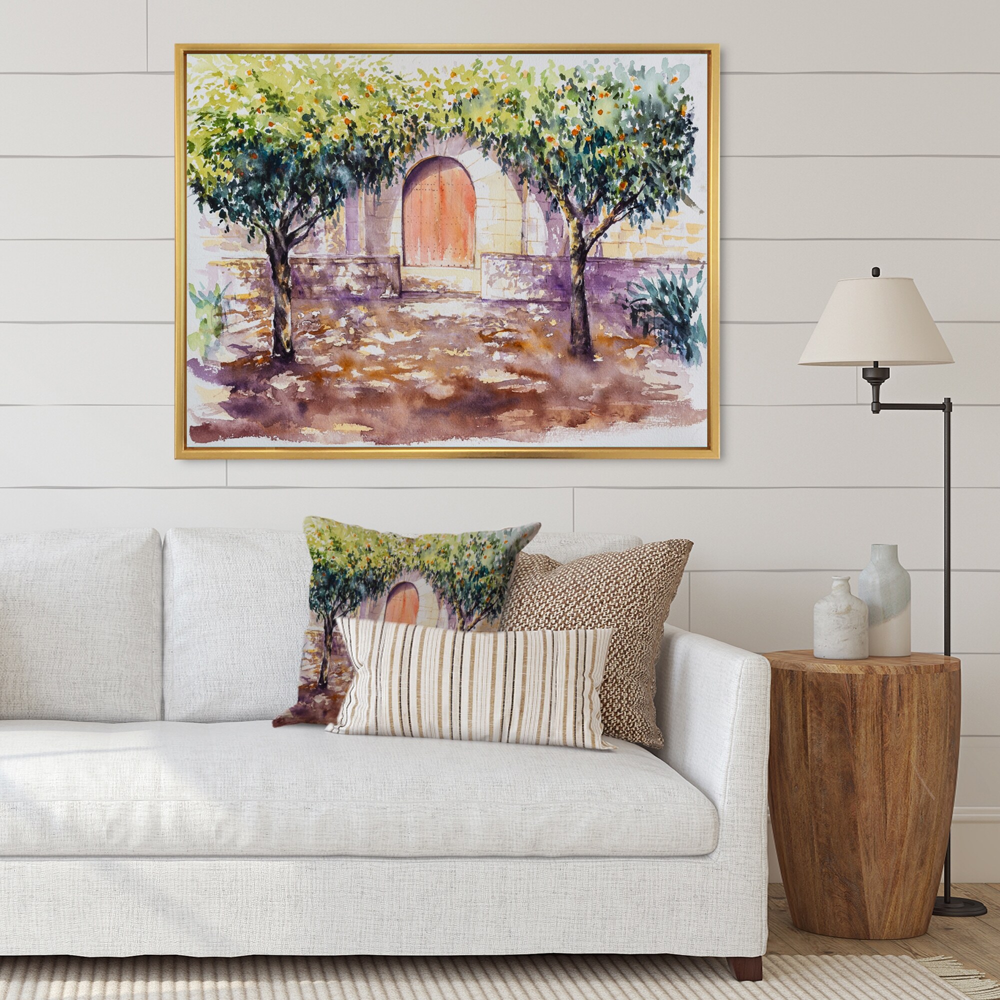 Designart "Backyard Library in Barcelona With Orange Trees" Traditional Framed Canvas Wall Art Print