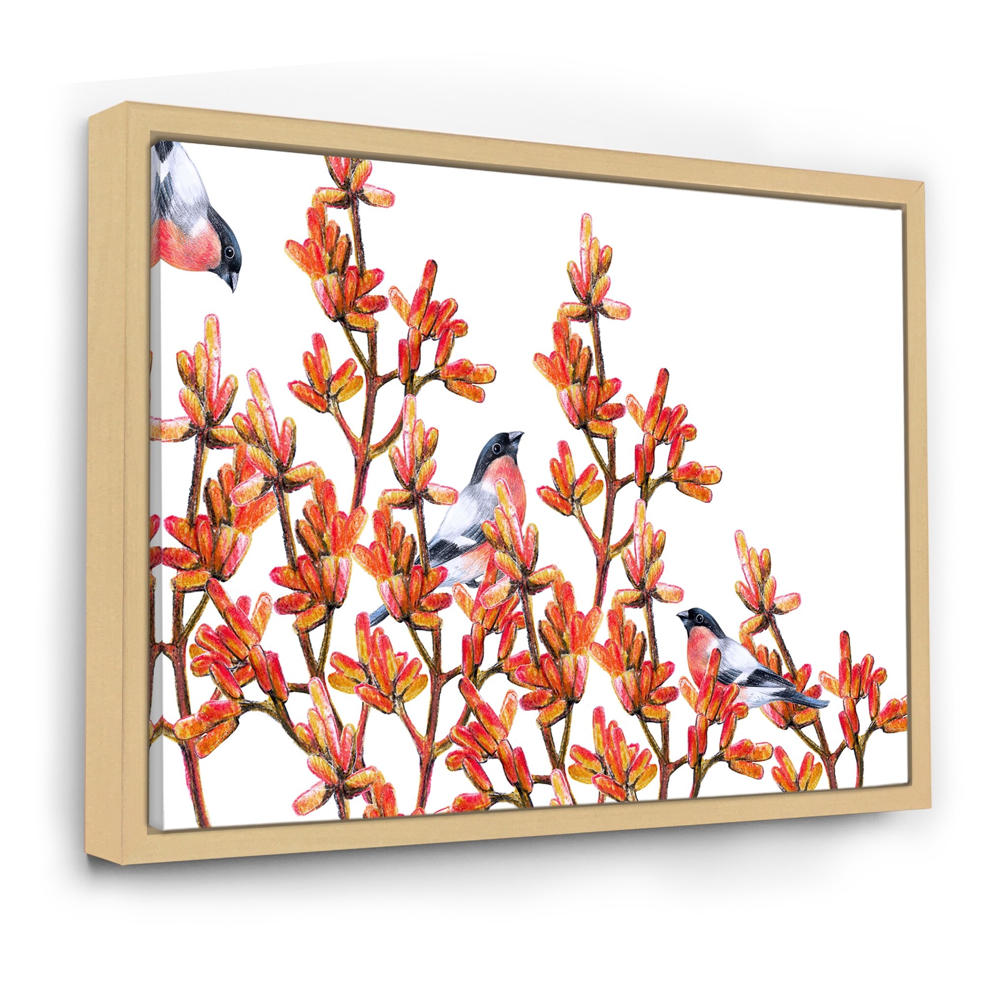 Designart "Flock of Bullfinches Birds on Orange Branches" Traditional Framed Canvas Wall Art Print