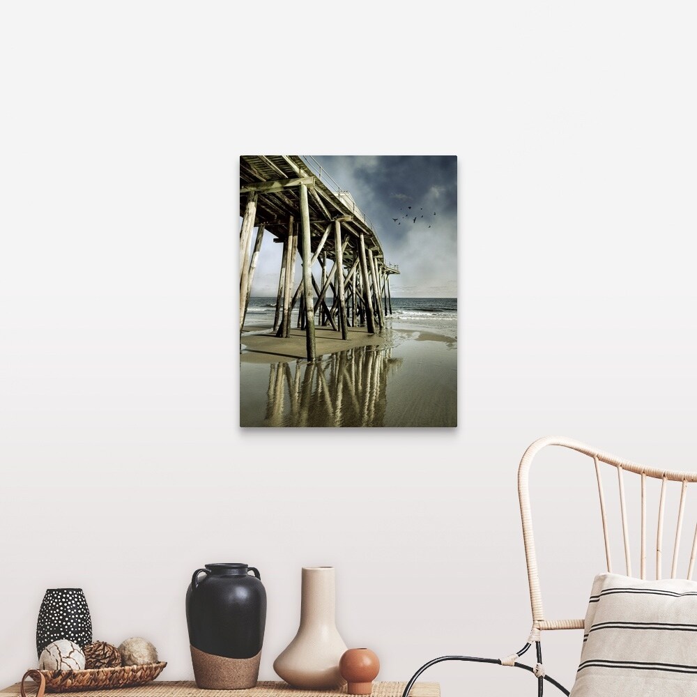 "Fishing shack pier with reflection in sea and flock of birds in sky." Canvas Wall Art