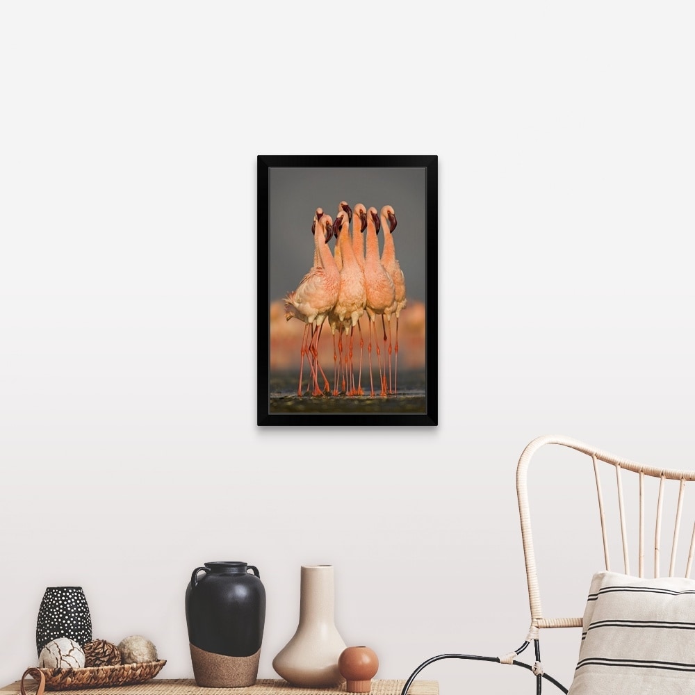 "Flock of eight flamingos wading in water, Lake Nakuru, Kenya" Black Framed Print