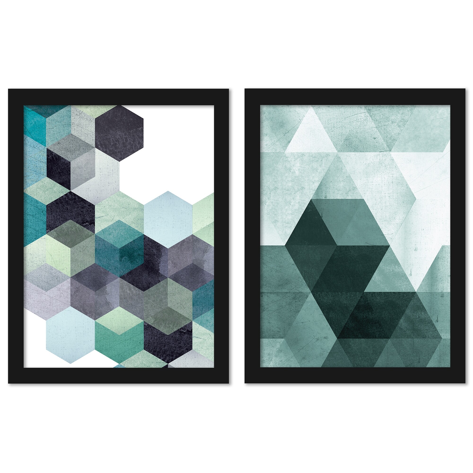 Designart "Vintage Green And Blue Minimalistic" Geometric Framed Art Set of 2 Pieces