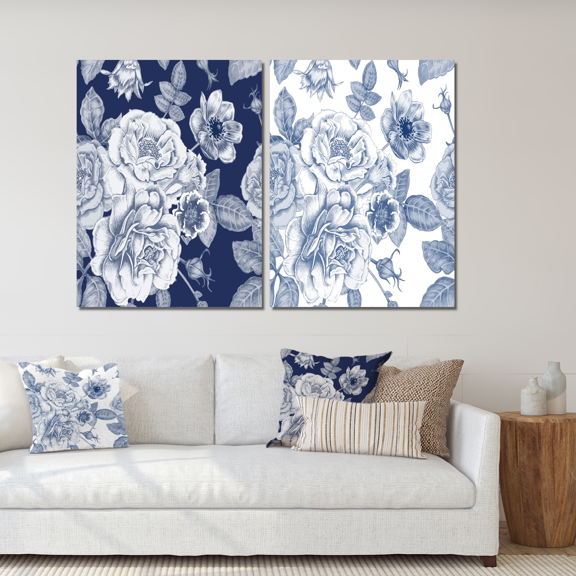 Designart 'White Vintage Flowers on Classic Blue I' Patterned Art Set of 2 Pieces