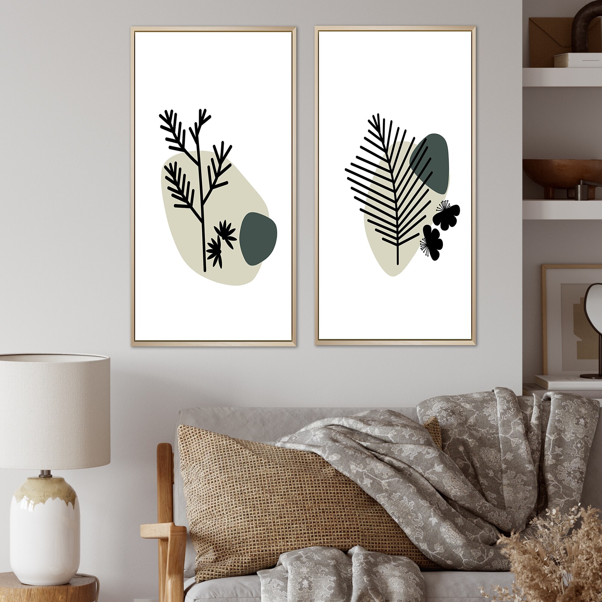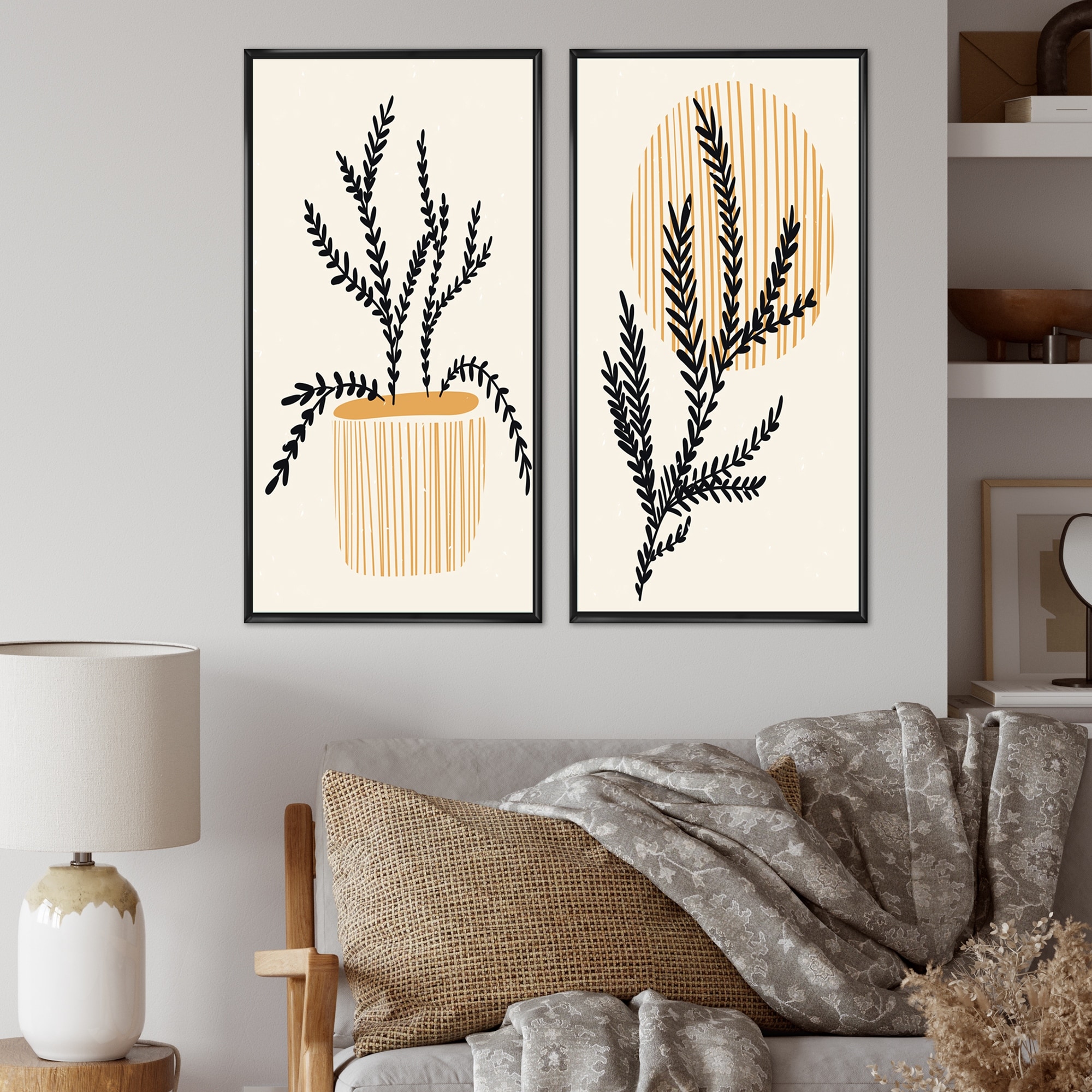 Designart "Dark Silhouettes of Plants on Cream III" Floral Framed Art Set of 2 Pieces
