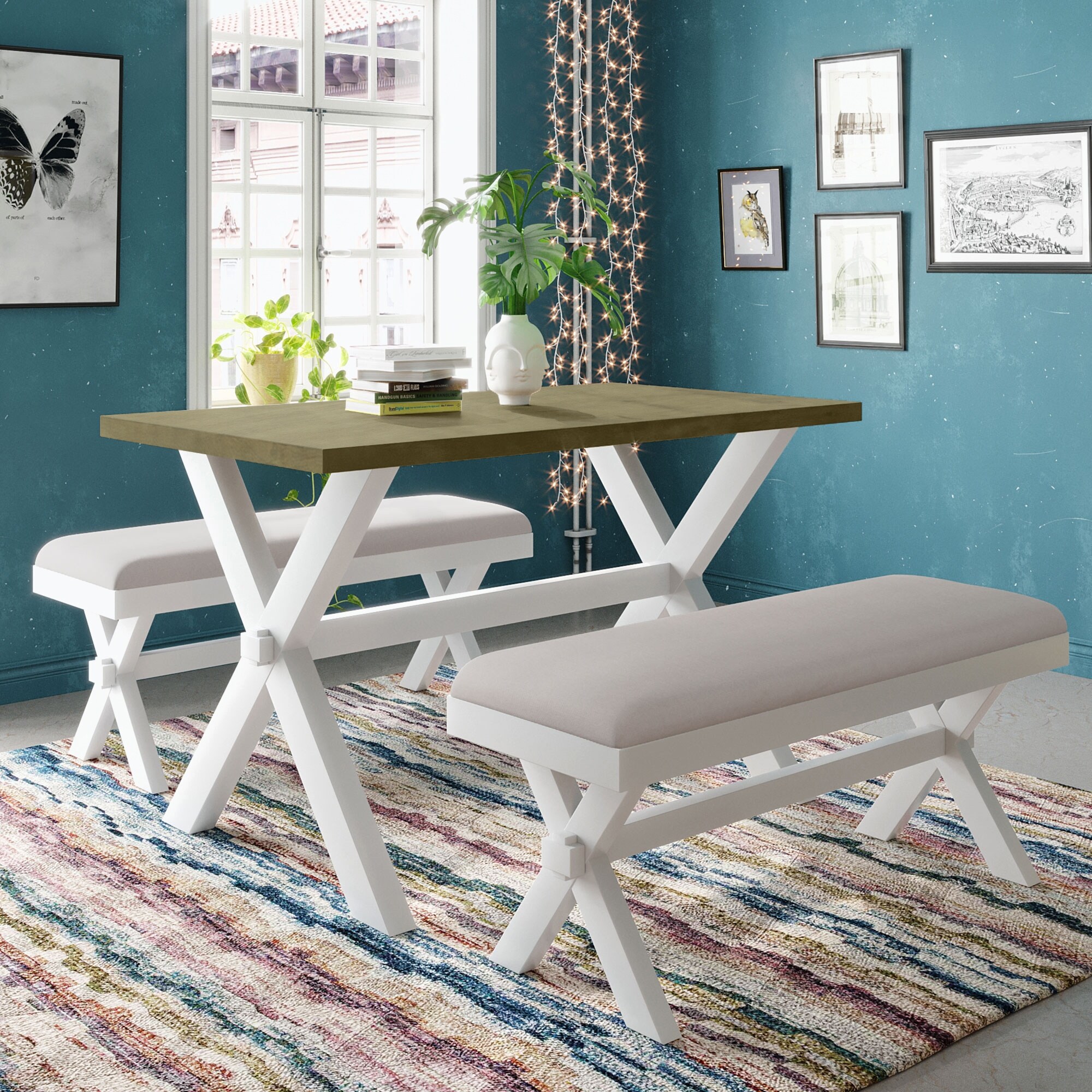 3 Pieces Wood Kitchen Dining Table Set with 2 Upholstered Benches