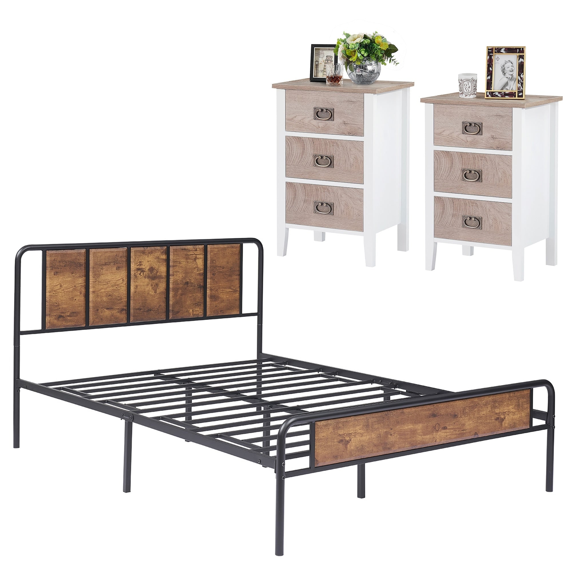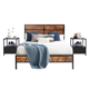 Taomika Industrial 3-pieces Bed with Wood Headboard and Square Nightstands Set