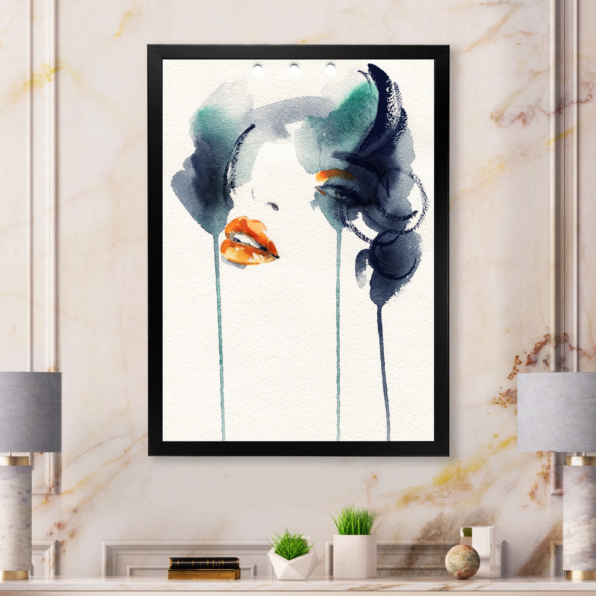 Designart "Abstract Portrait of a Woman With Blue Hair Red Lips" Glam Framed artwork