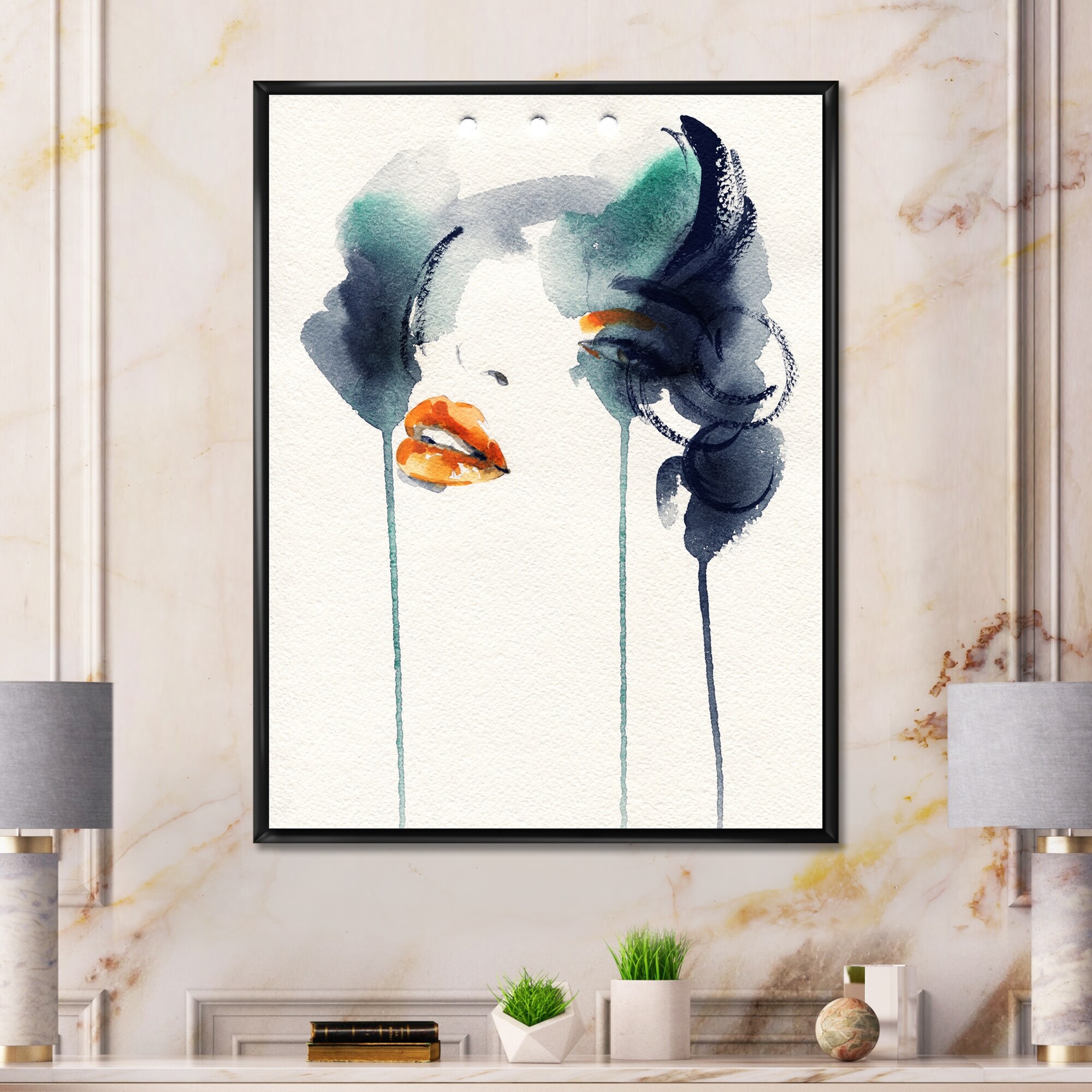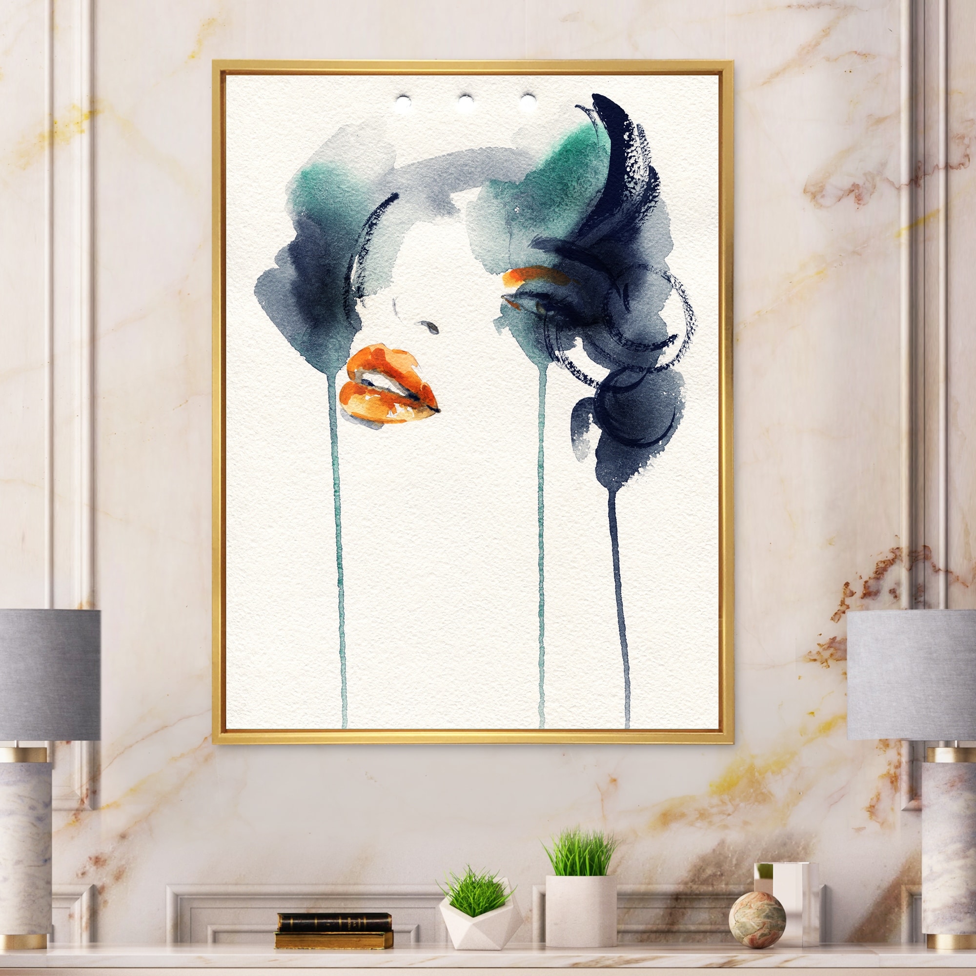 Designart "Abstract Portrait of a Woman With Blue Hair Red Lips" Glam Framed Canvas artwork