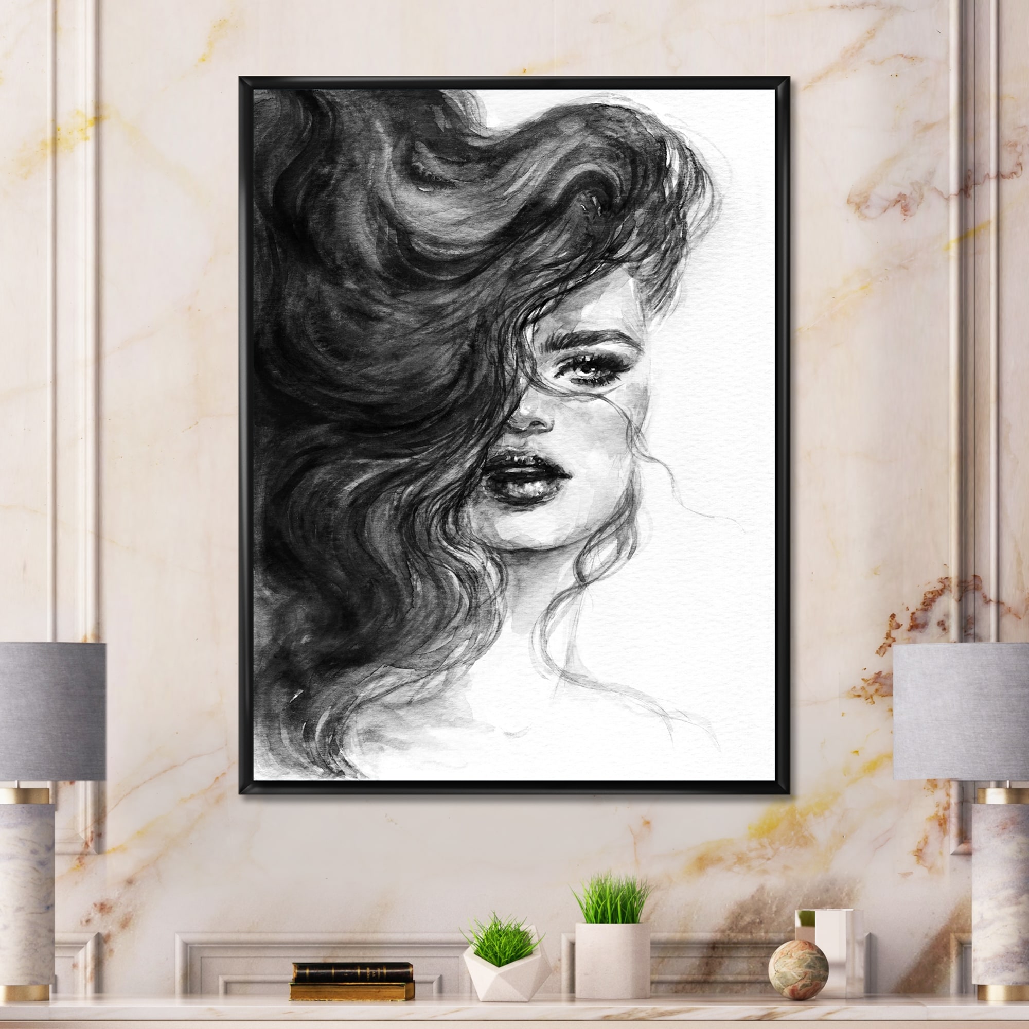 Designart "Monochrome Portrait of Woman With Wavy Hair" Glam Framed Canvas artwork