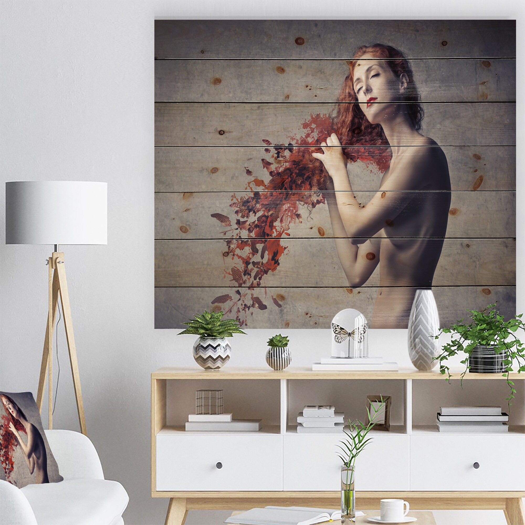 Designart 'From Red Hair to Leaves' Contemporary Print on Natural Pine Wood - Black
