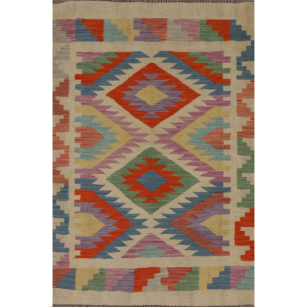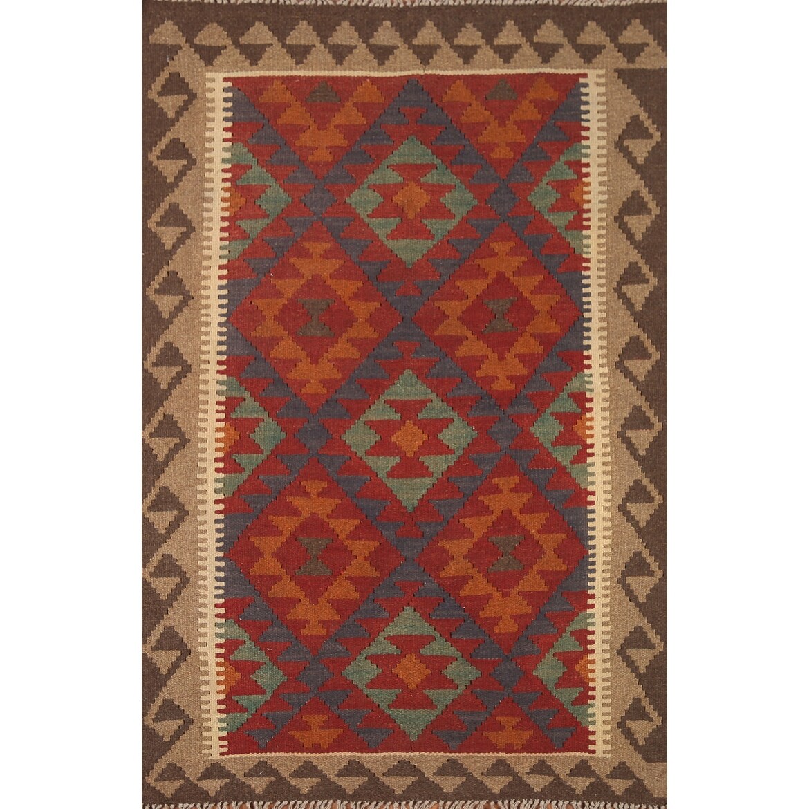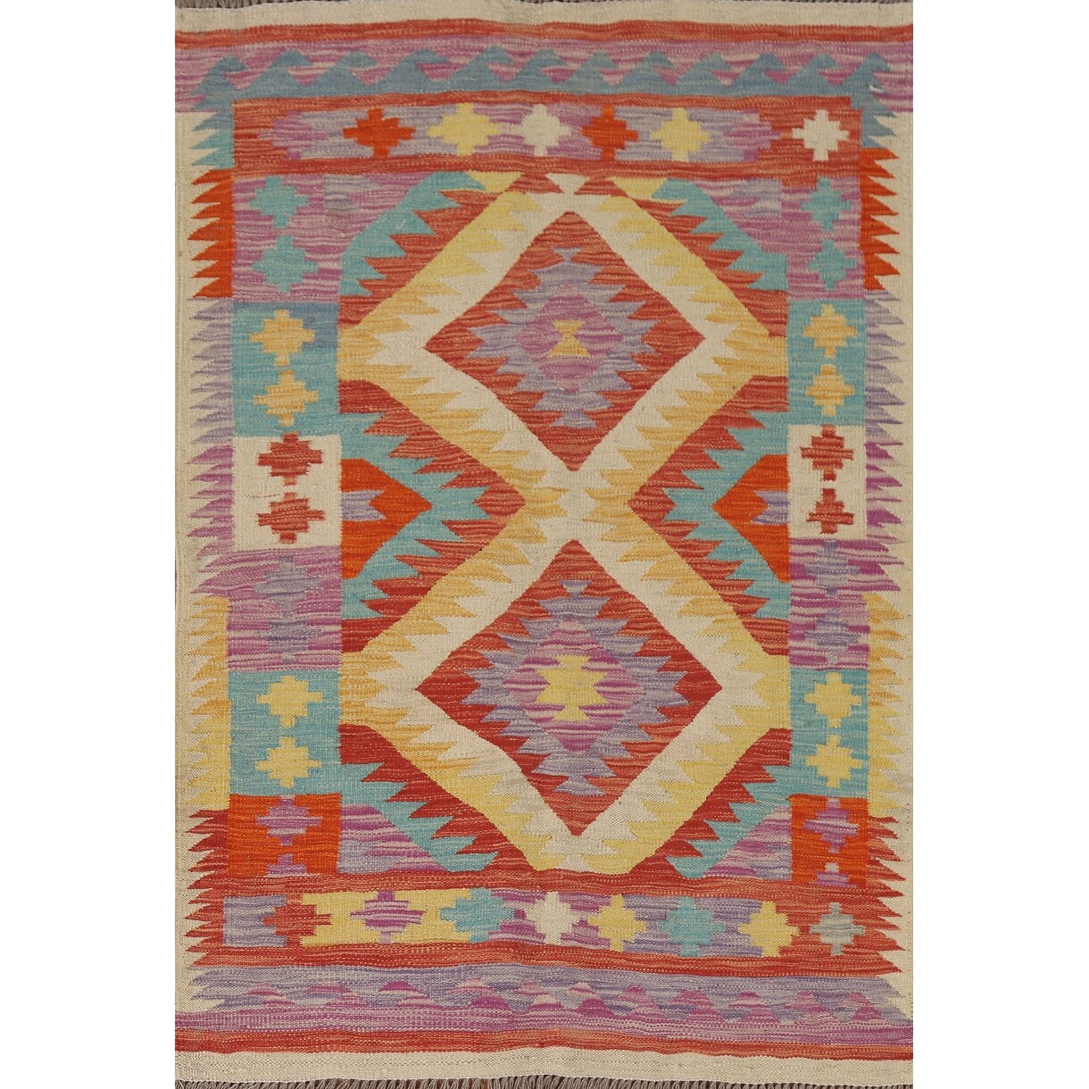 Geometric Kilim Oriental Area Rug Hand-woven Wool Carpet - 3'2" x 5'1"