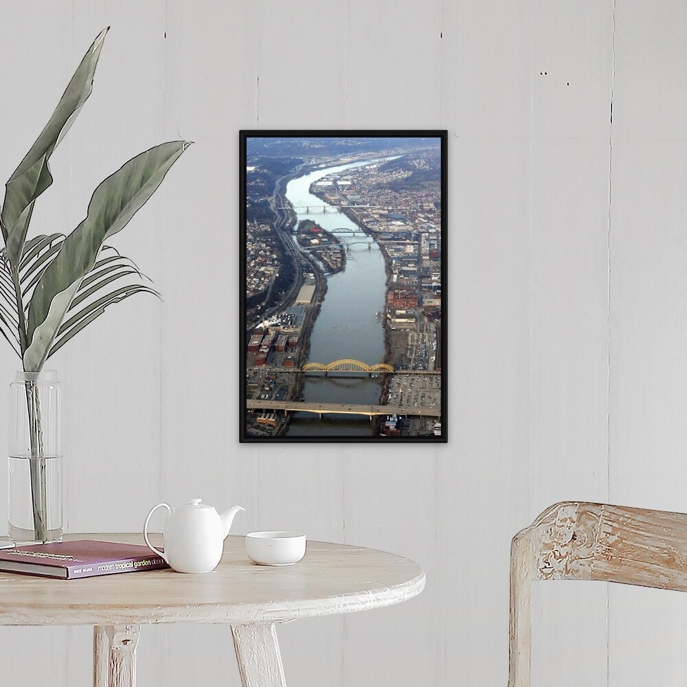 "Aerial shot of bridges over a river in Pittsburgh, Pennsylvania" Black Float Frame Canvas Art