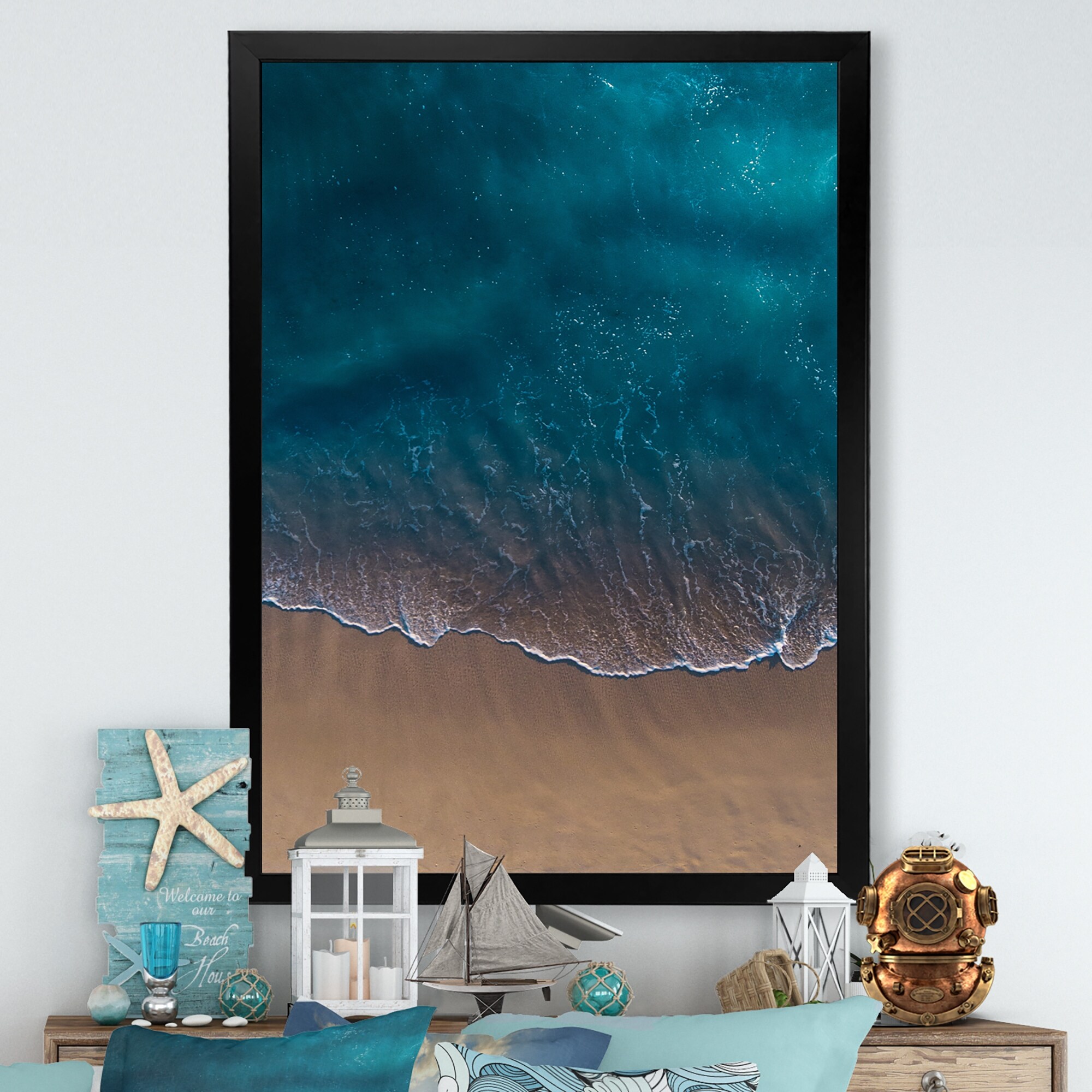 Designart "Aerial View of Blue Ocean With Beach" Nautical & Coastal Framed Art Print