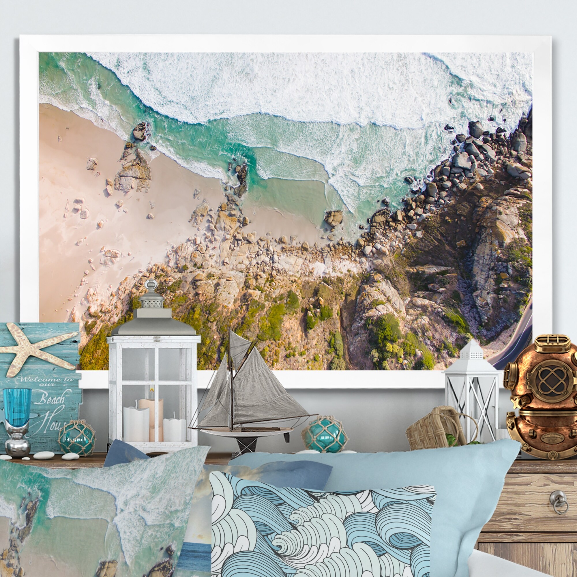 Designart "Beach Rocks And Shore Aerial View II" Nautical & Coastal Framed Wall Decor