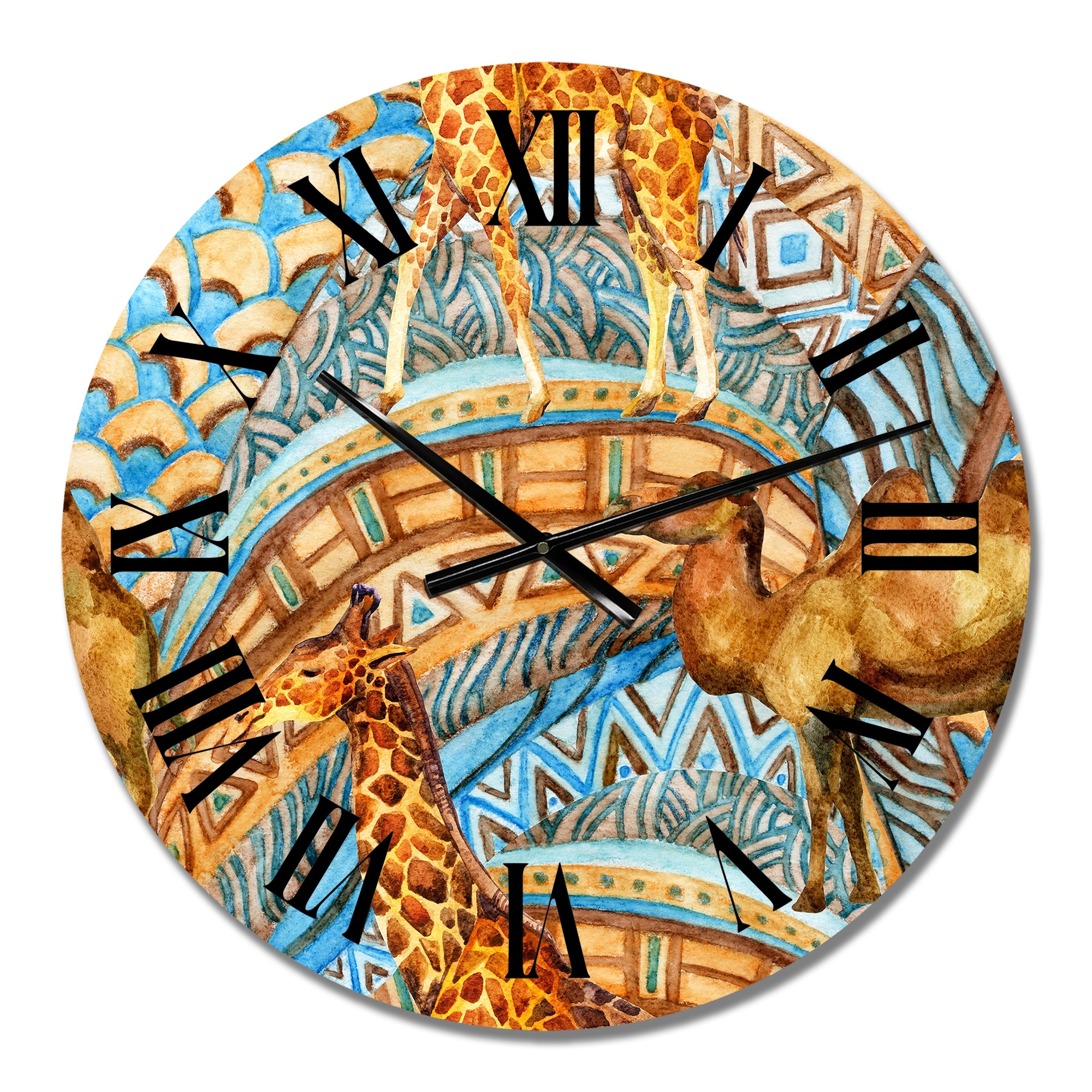 Designart 'Giraffe And Cameleon on African Geometrics' Patterned wall clock