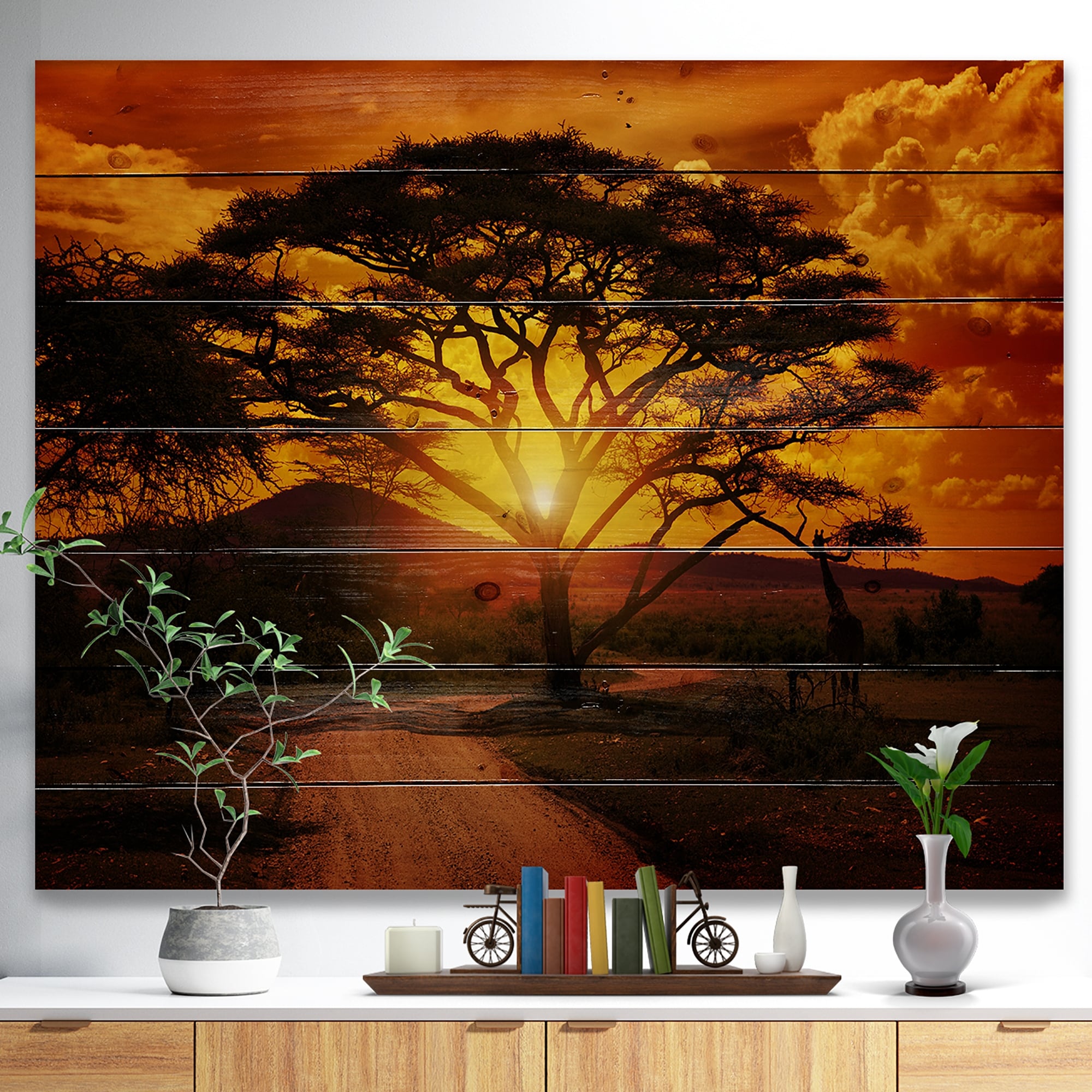 Designart 'African Sunset With Lonely Tree' Traditional Wood Wall Art - Natural Pine Wood