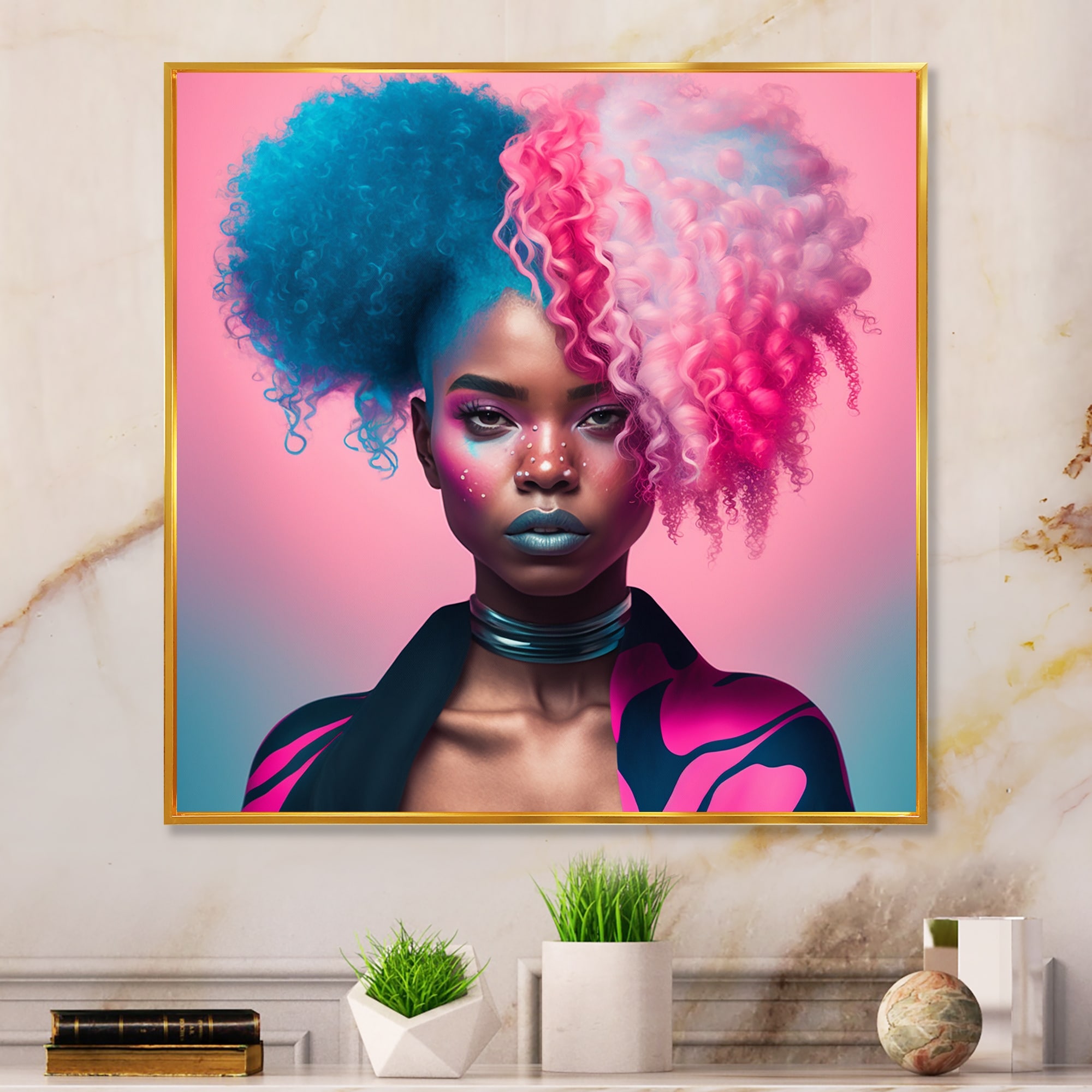Designart "Pink And Blue African American Woman VII" Contemporary Glam Framed Canvas Art Print