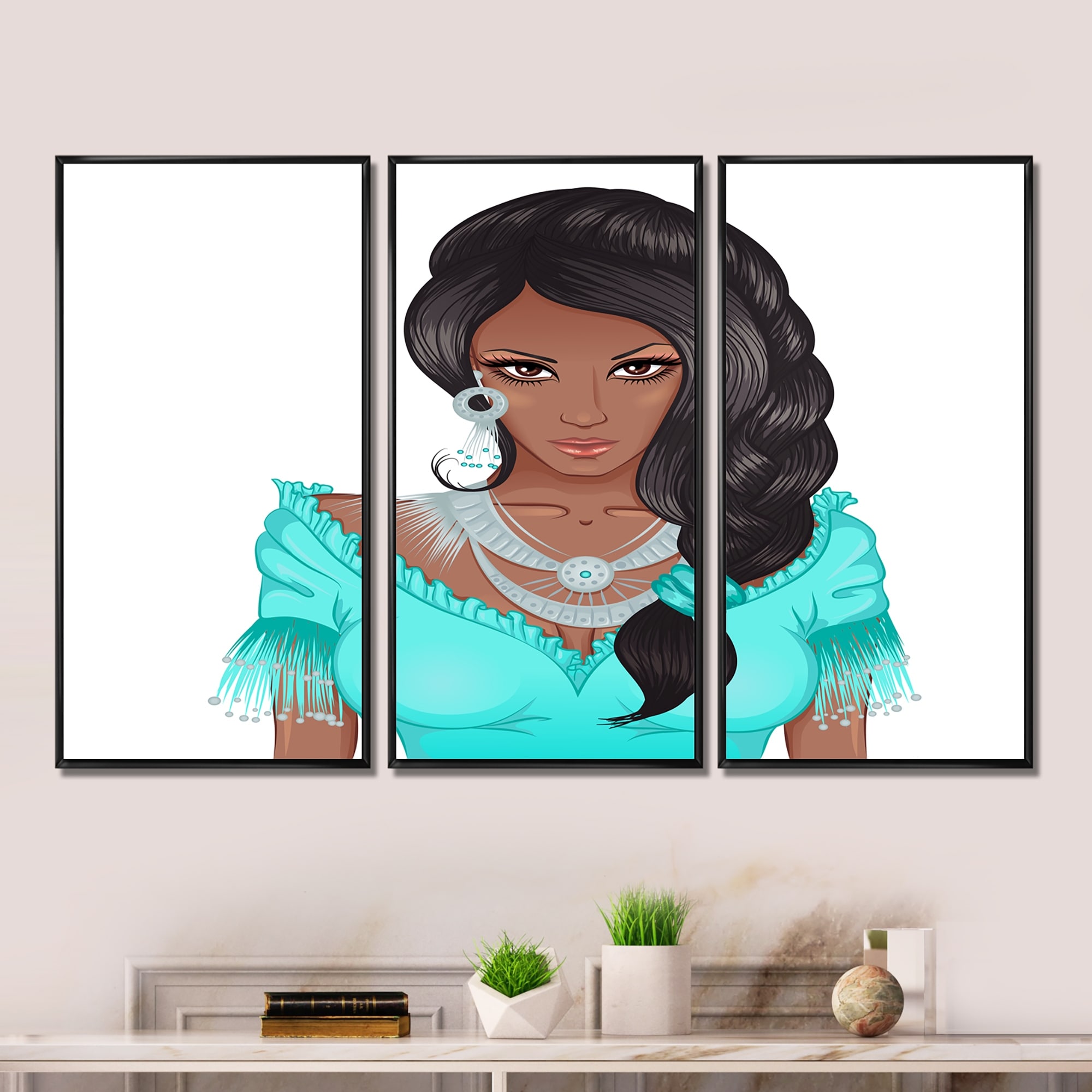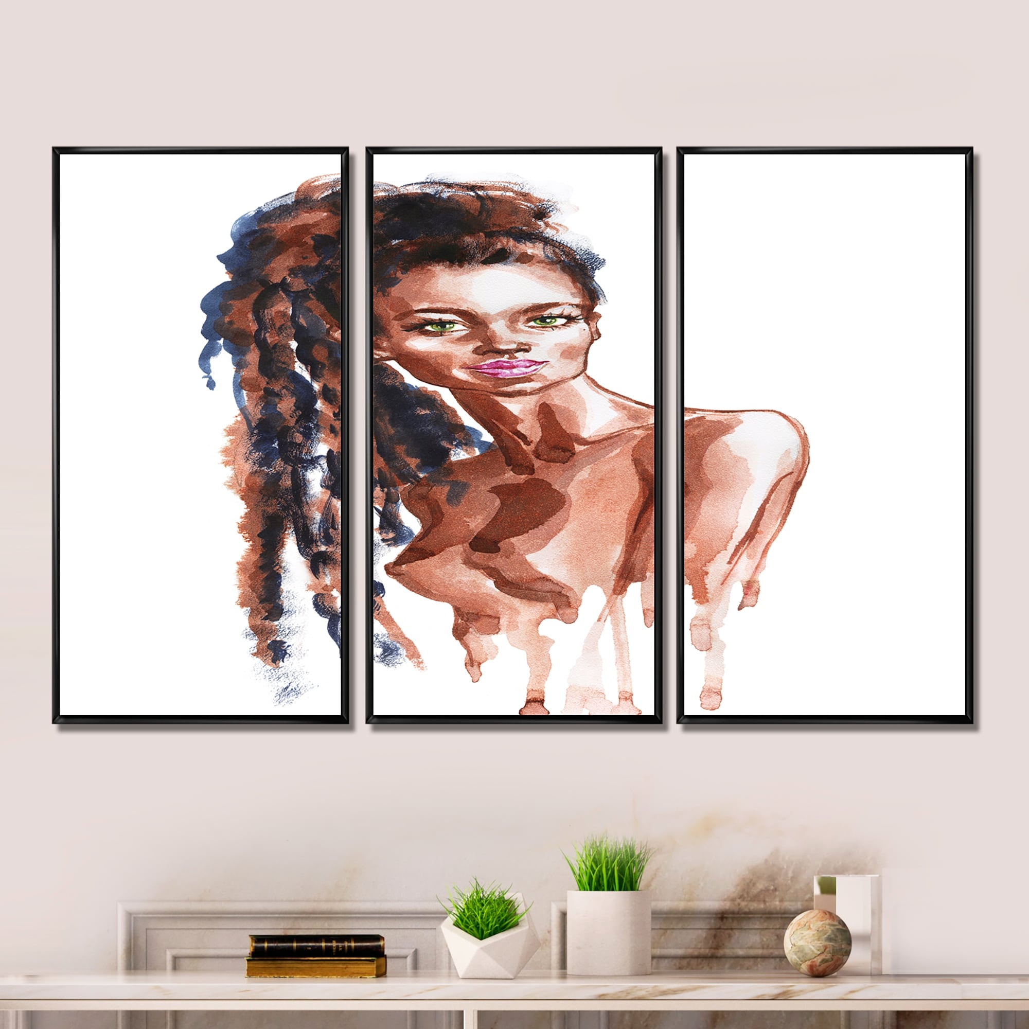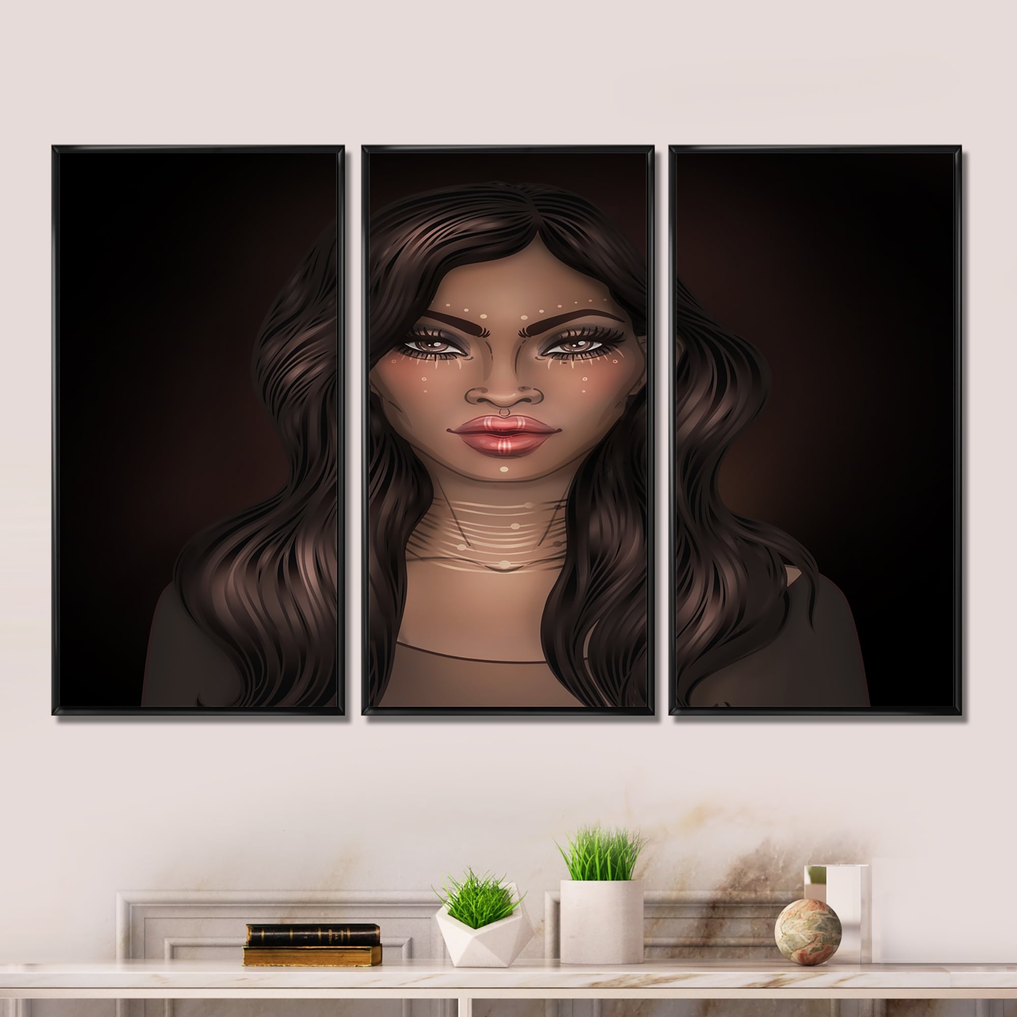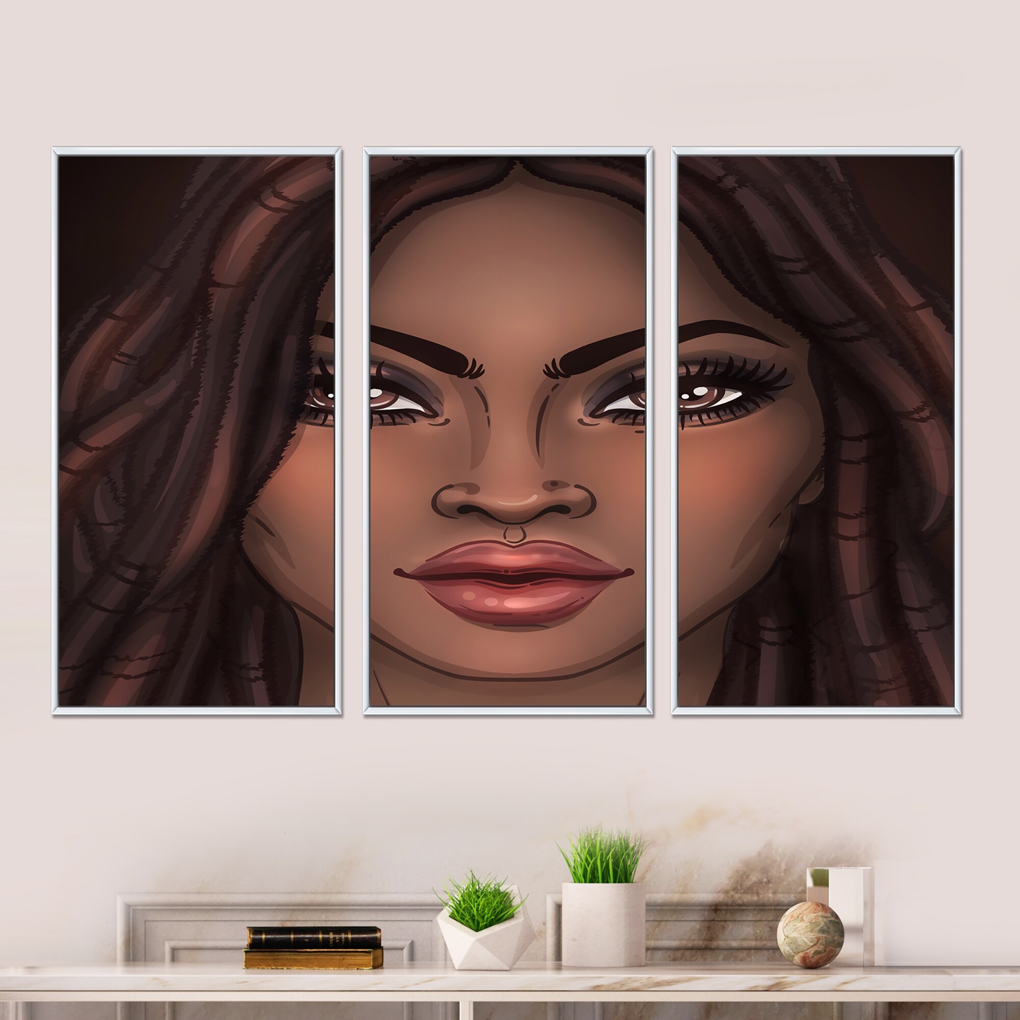Designart "Portrait of African American Woman VIII" Modern Framed Canvas Wall Art Set of 3 - 4 Colors of Frames