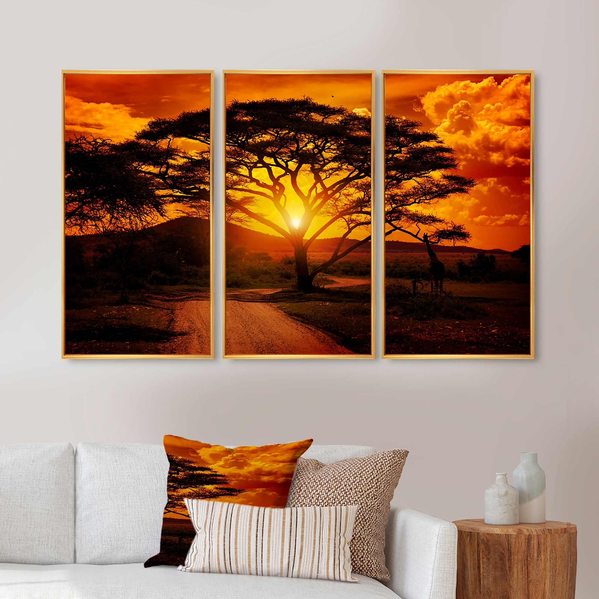 Designart "African Sunset with Lonely Tree" Landscape Framed Wall Art Set of 3 - 4 Colors of Frames