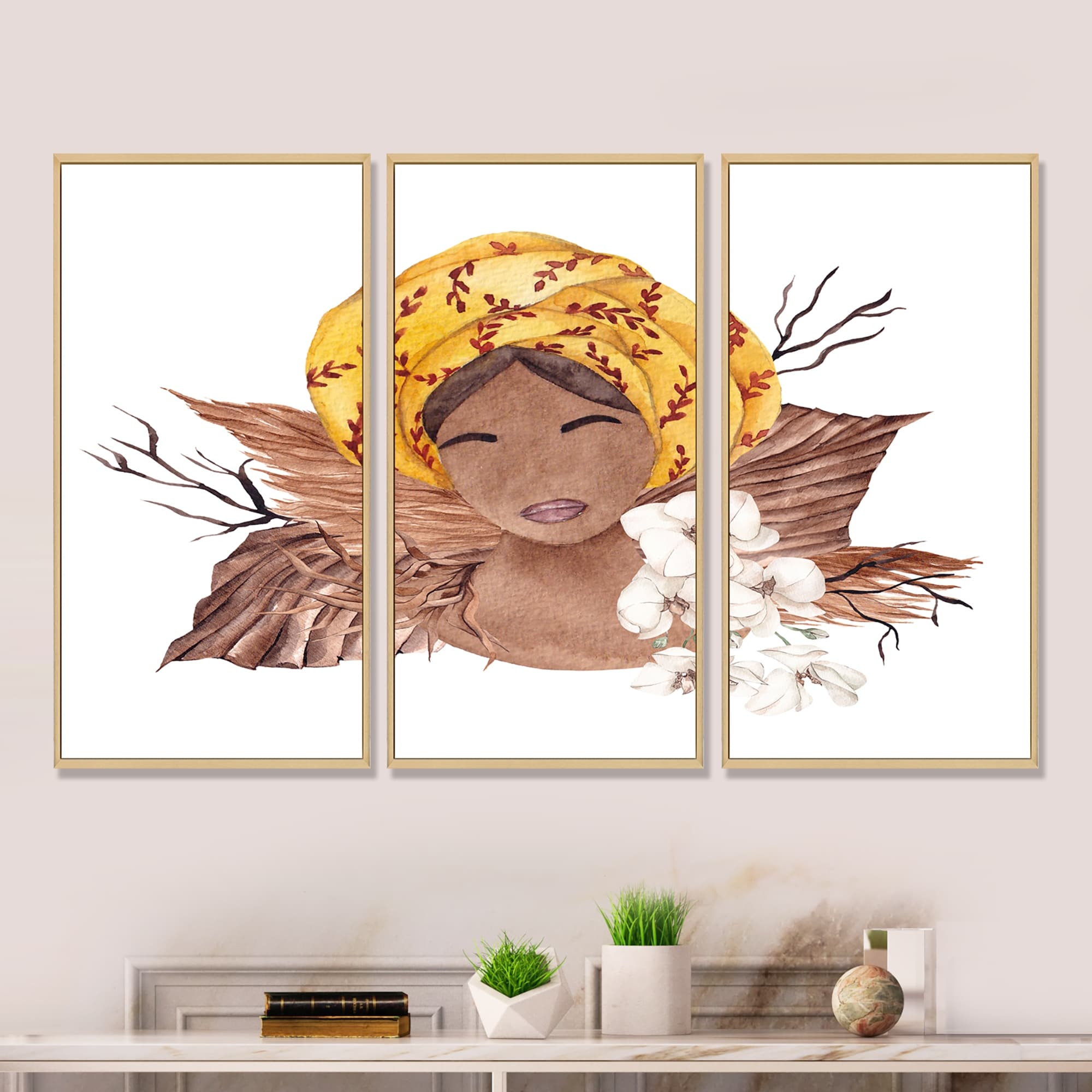 Designart "African American Woman, Dried Flowers, Leaves V" Glam Framed Art Set of 3 - 4 Colors of Frames