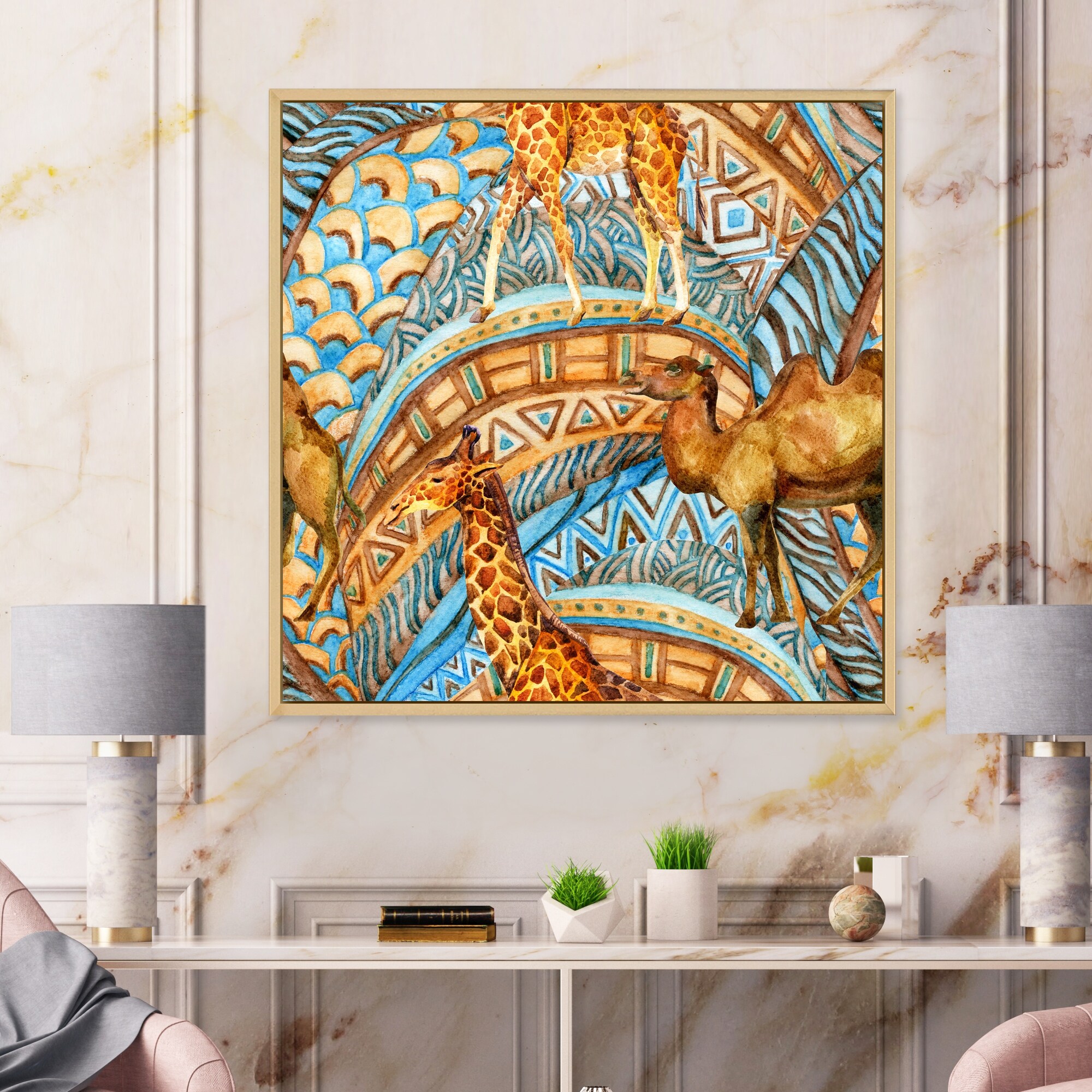Designart "Giraffe And Cameleon on African Geometrics" Patterned Framed Canvas Wall Art Print