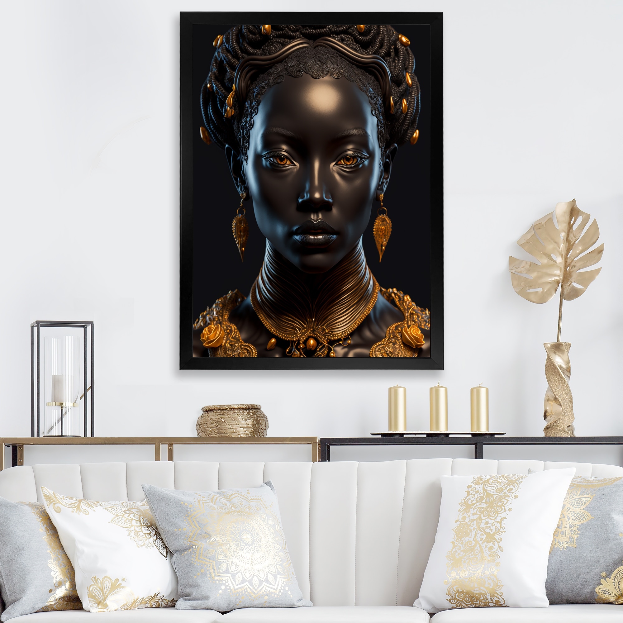 Designart "Close-Up Black And Gold African Goddess IV" African American Woman Framed Wall Decor