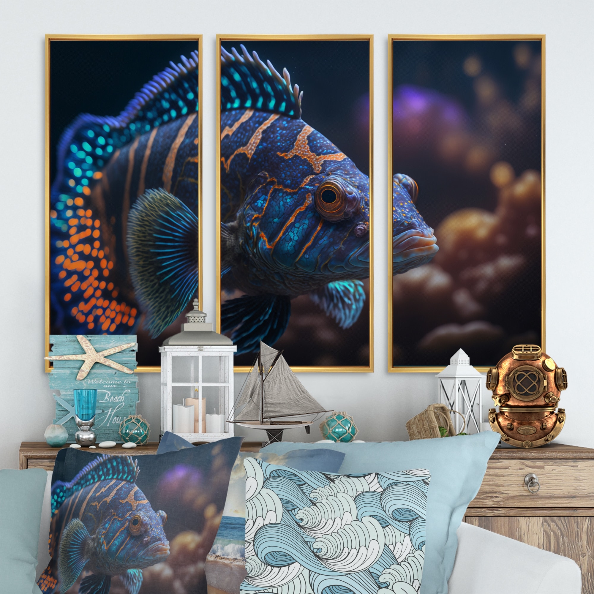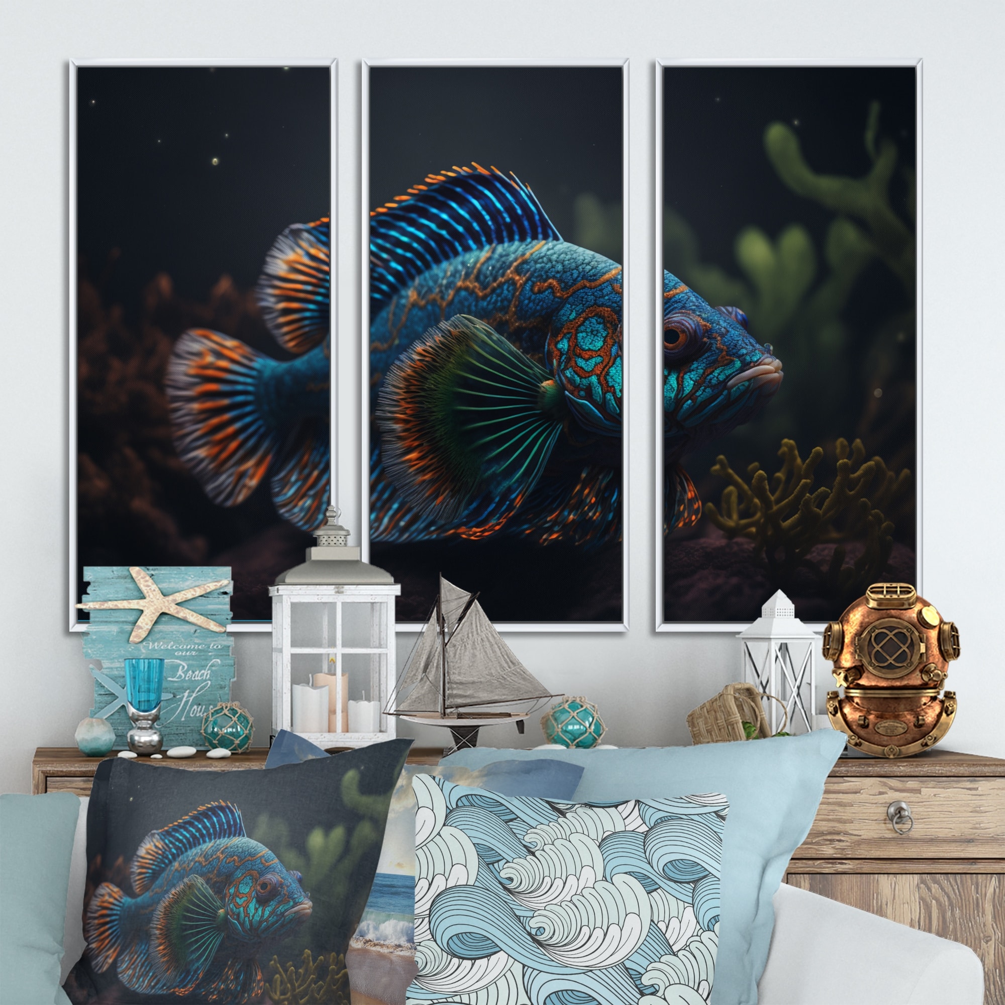 Designart "Beautiful Mandarin Fish in Shades of Blue I" Animal Fish Framed Canvas Wall Art Print - 3 Panels