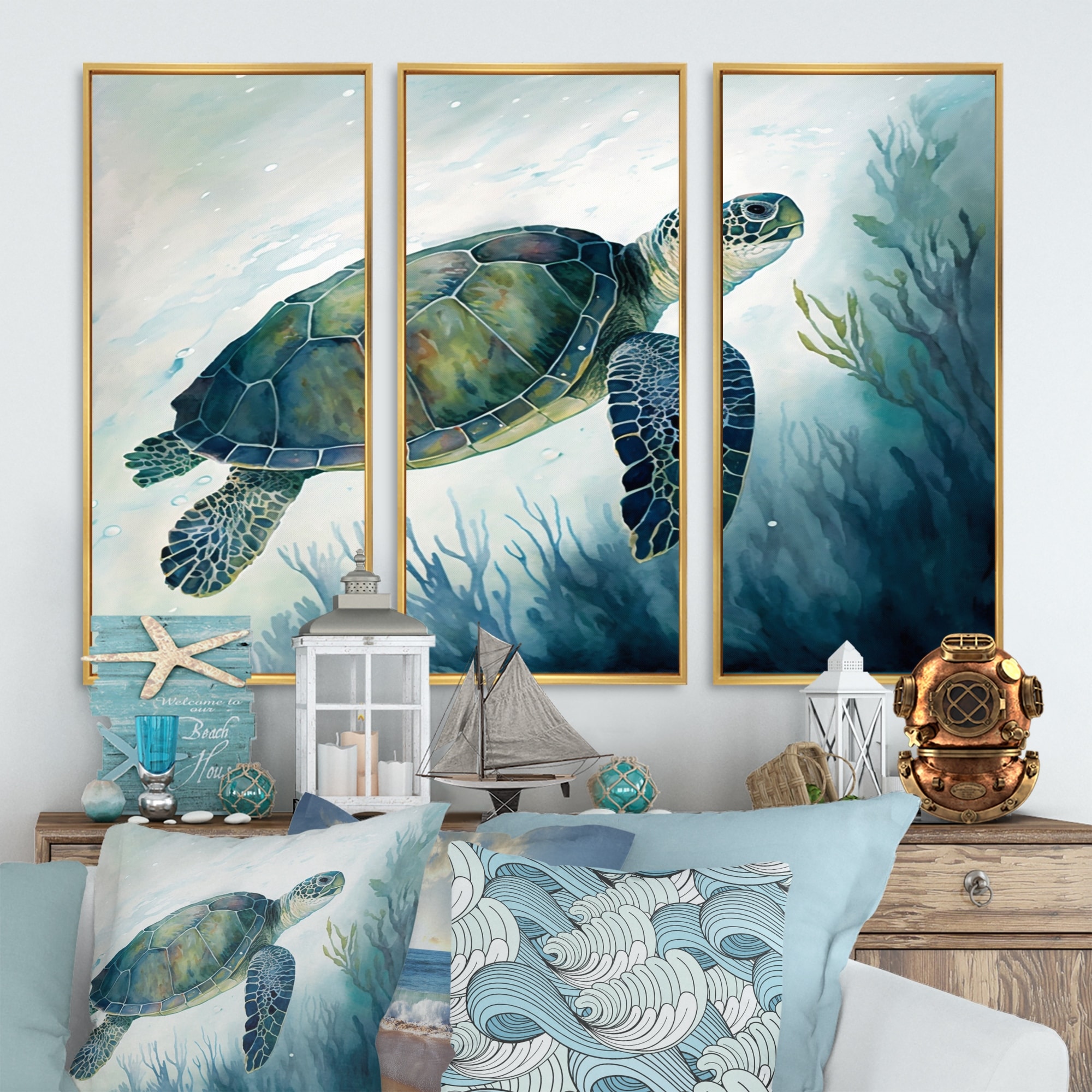 Designart "Watercolor Turtle Swimming III" Animals Turtle Framed Canvas Wall Art Print - 3 Panels