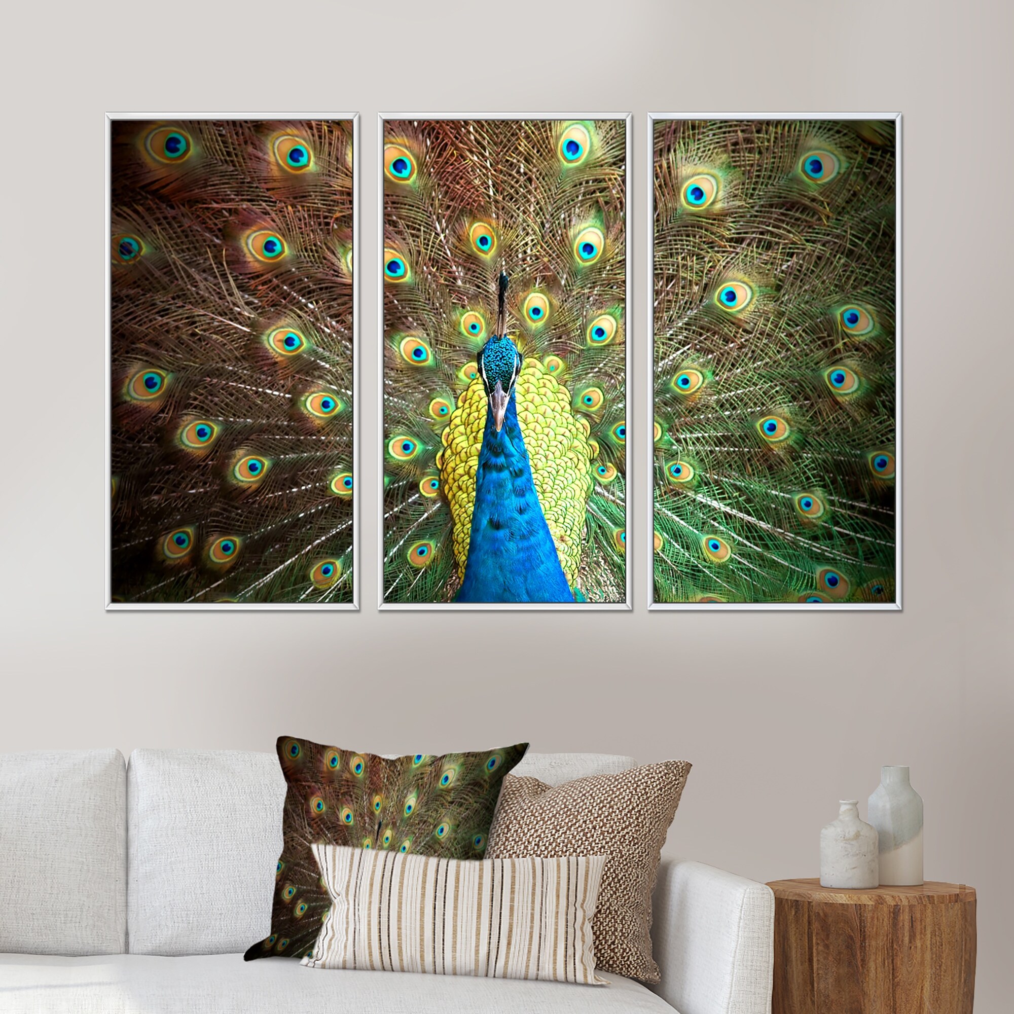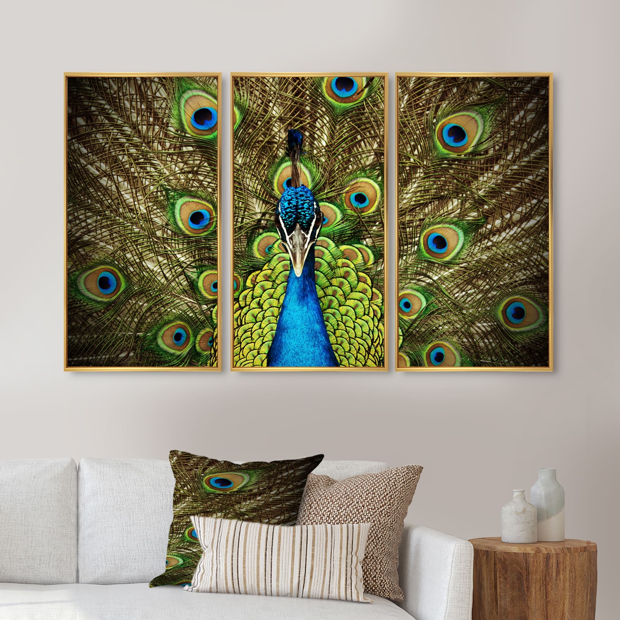 Designart "Grand Peacock" Animal Framed Art Set of 3 - 4 Colors of Frames