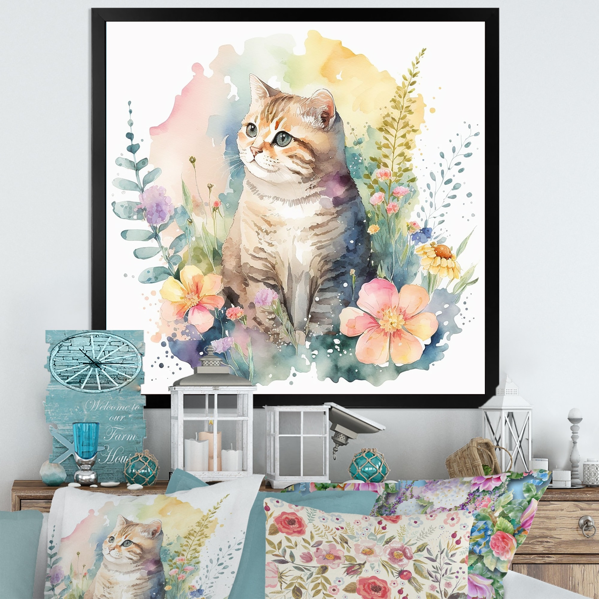 Designart "Little Kitten Surrounded By Colorful Flowers I" Animals Cat Framed Art Print