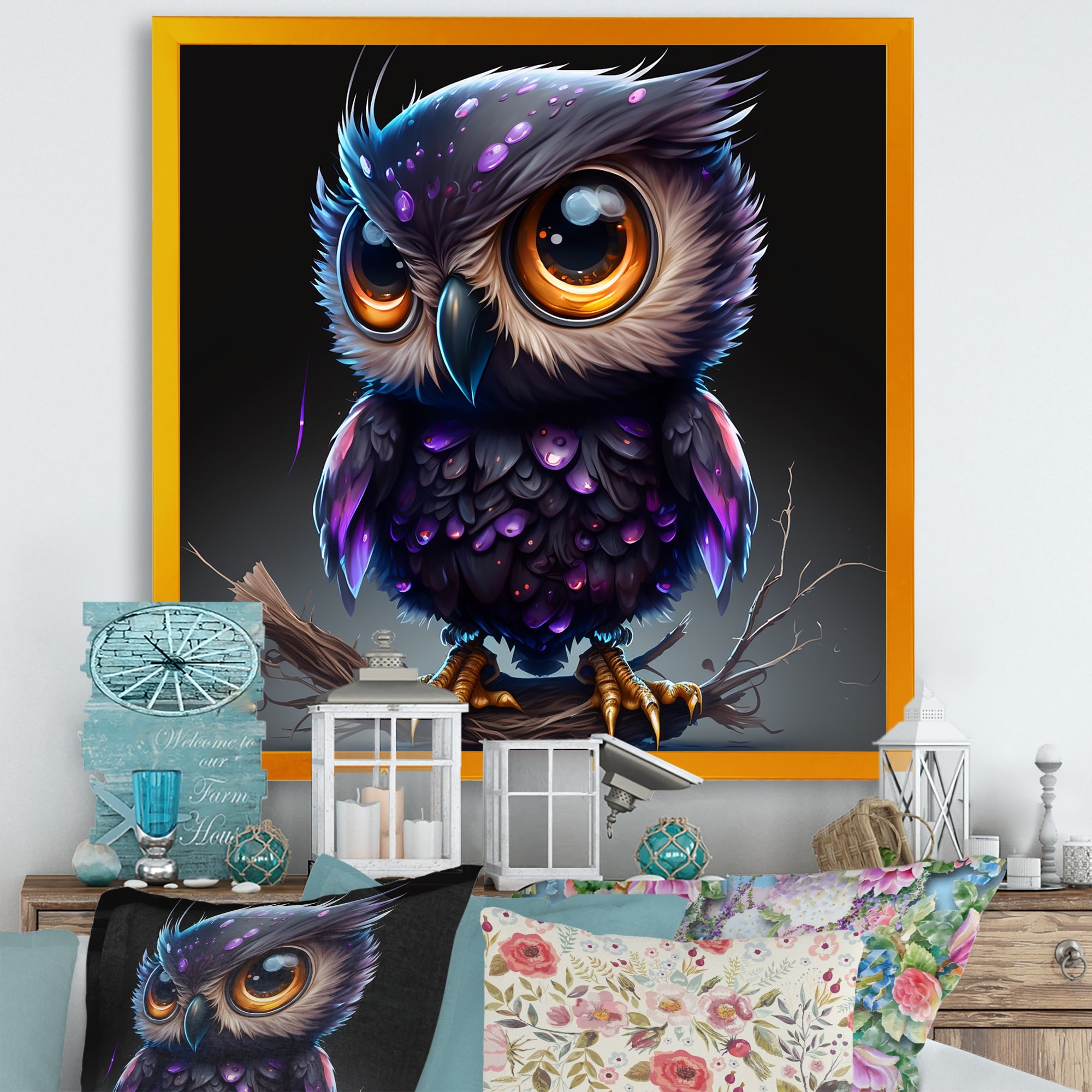 Designart "Cute Little Purple Owl on A Branch I" Animals Owl Framed Art Print