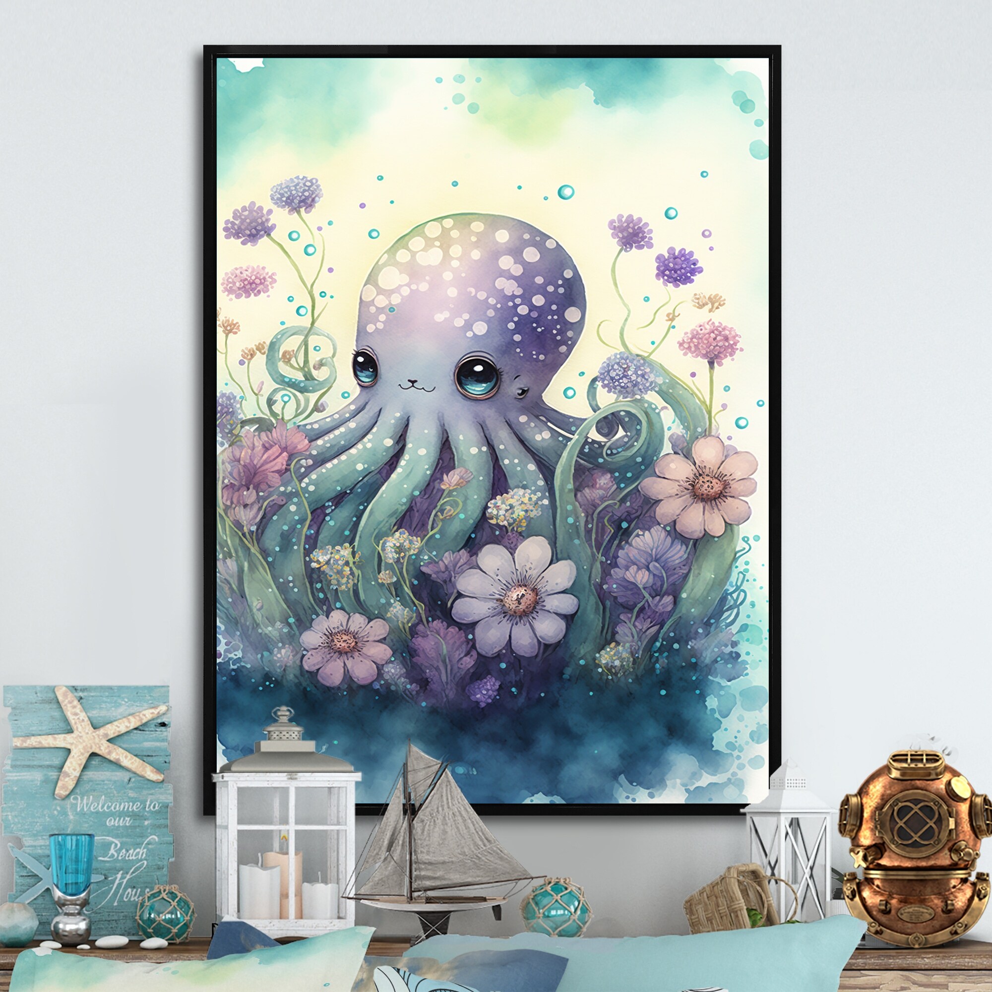 Designart "Cute Little Baby Octopus Surrounded By Flowers I" Animal Octopus Framed Canvas Wall Art Print