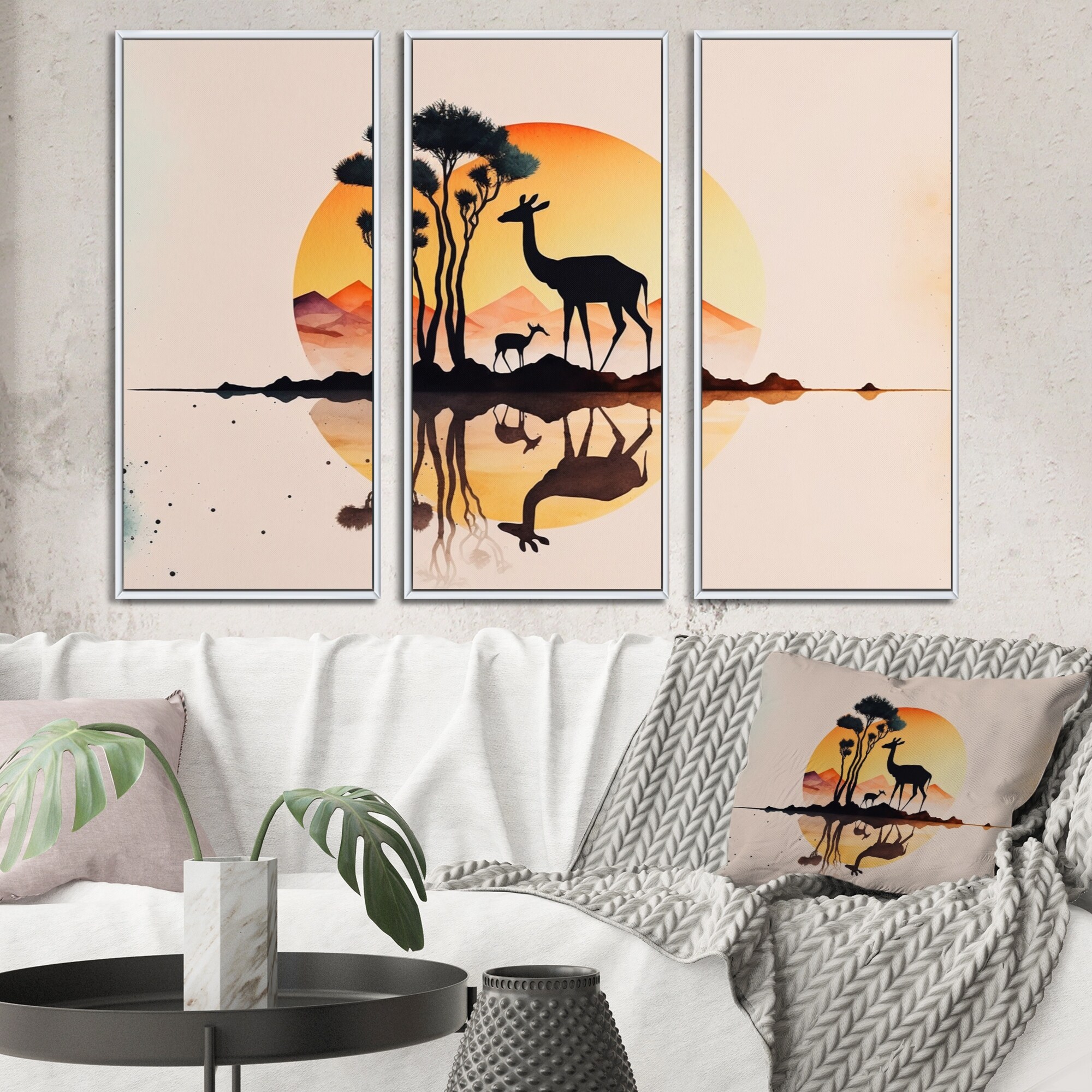 Designart "Giraffe At Sunset" Animals Giraffe Framed Canvas Wall Art Print - 3 Panels