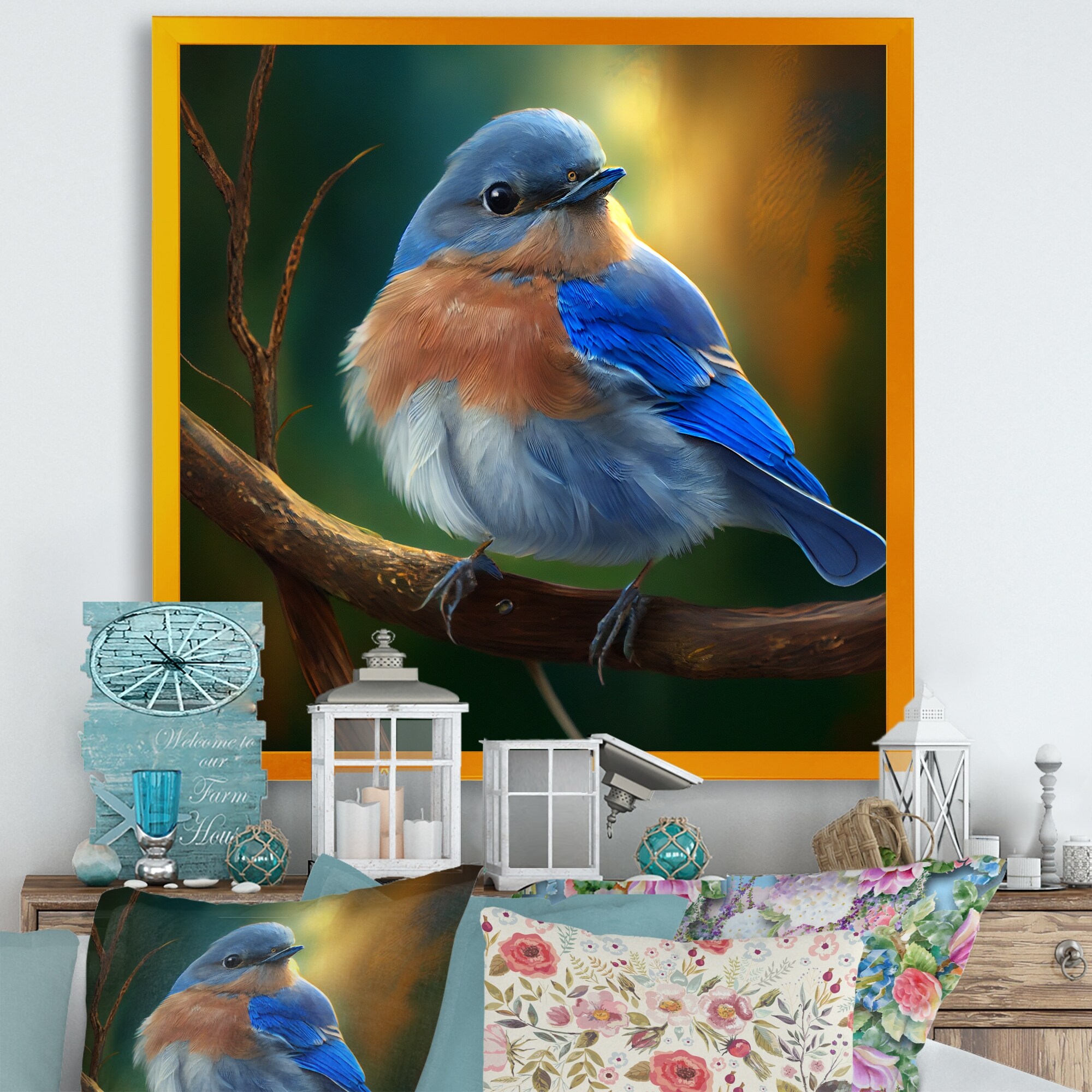 Designart "Beautiful Bright Bluebird on A Branch III" Animals Bird Framed Art Print