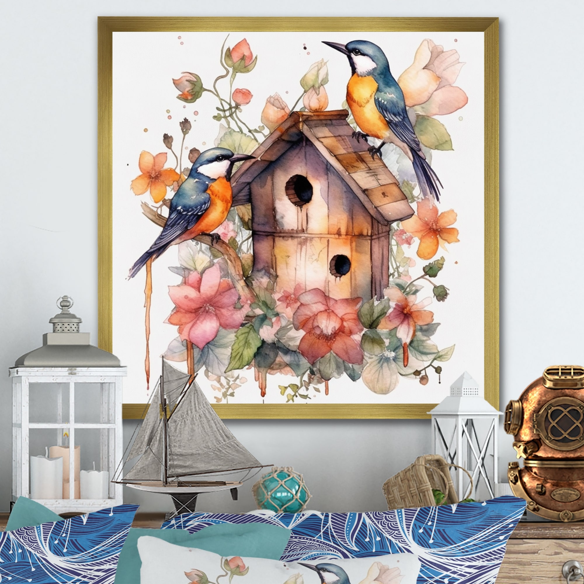 Designart "Birds On A Birdhouse" Animals Bird Framed Wall Art for Living Room