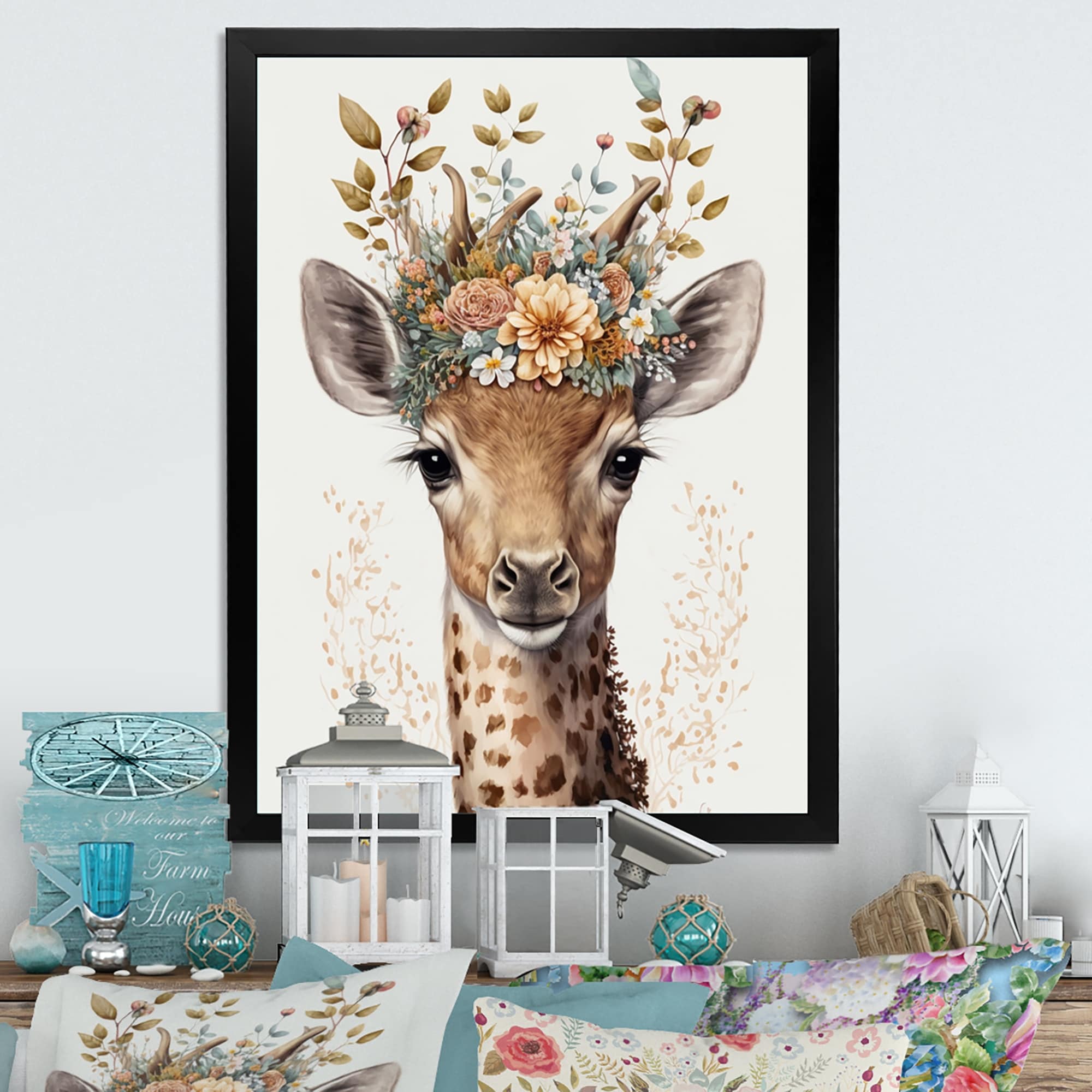 Designart "Cute Baby Giraffe With Floral Crown II" Animals Framed Art Print