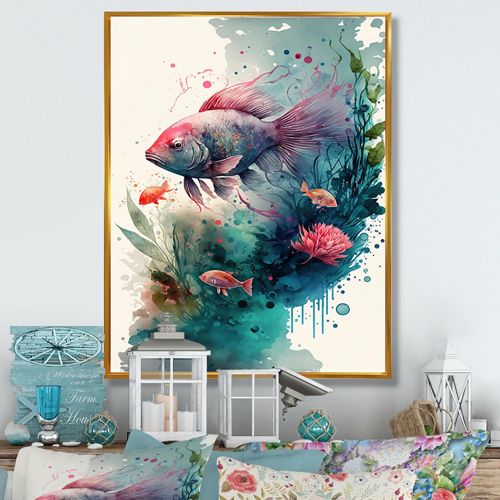 Designart "Cute Fish Floral Art I" Animals Framed Canvas Art Print