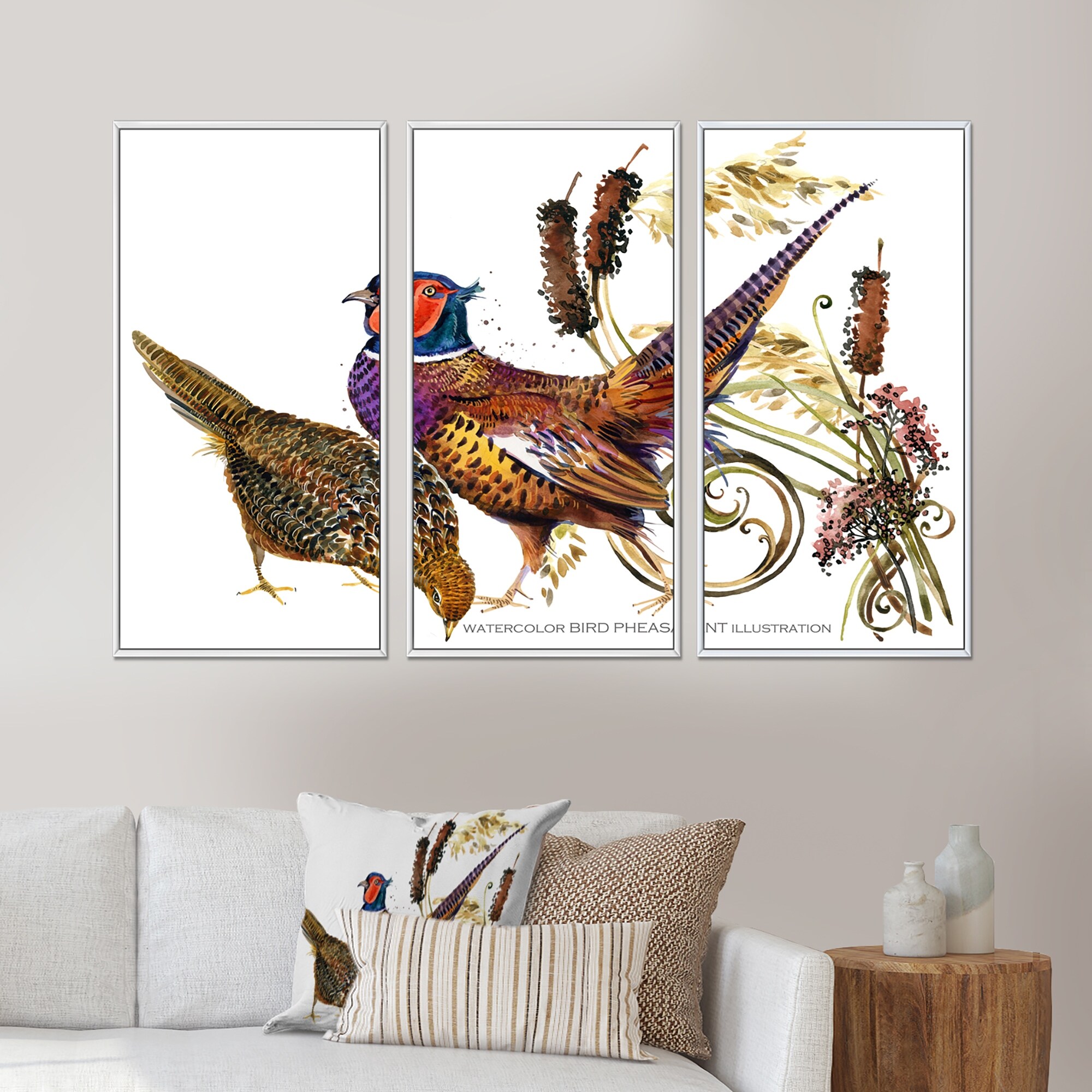 Designart "Bird pheasant watercolor" Animal Framed Artwork Set of 3 - 4 Colors of Frames