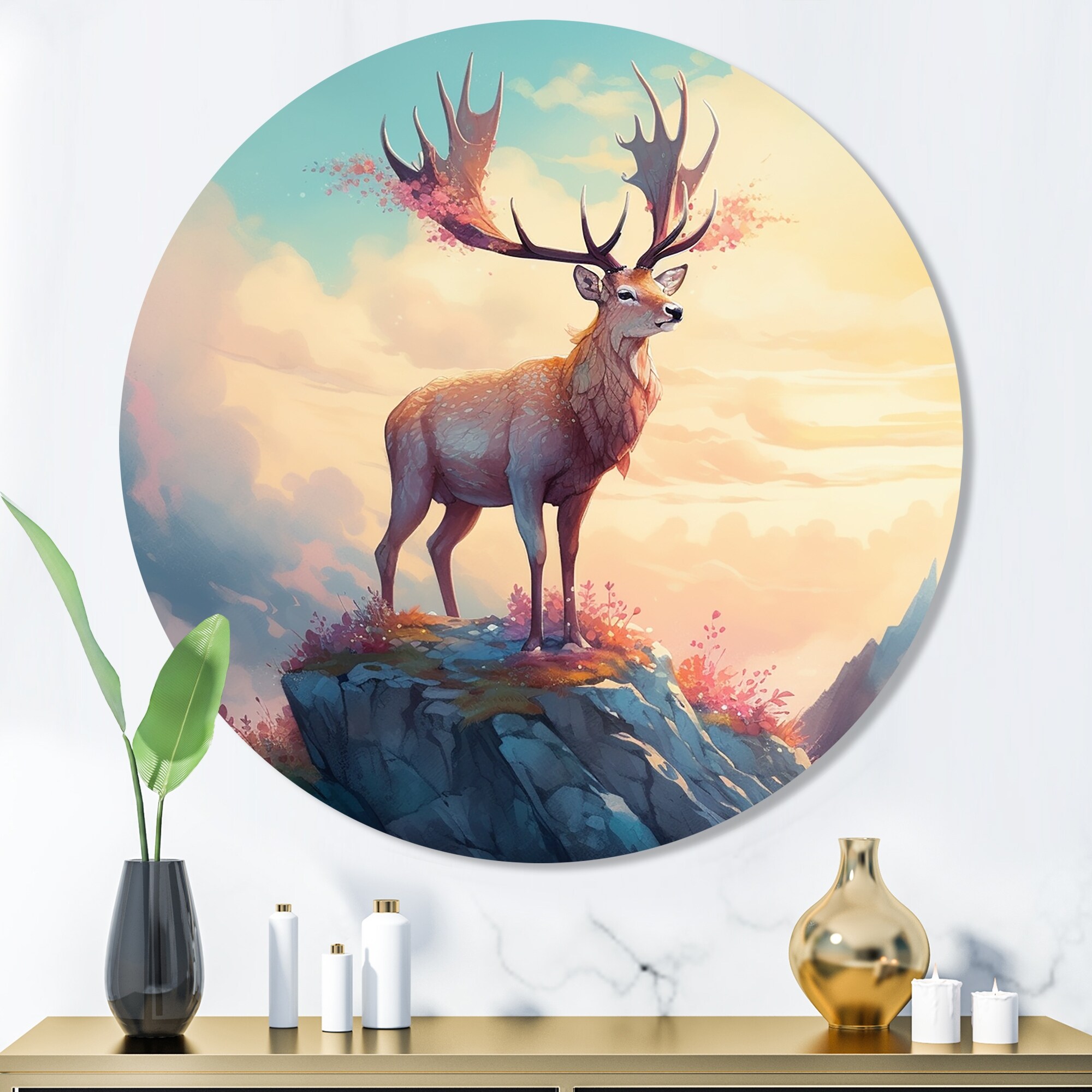 Designart "Mystal Stag on Cliff At Sunset II" Animal Deer Landscape Mountains Metal Round Wall Art