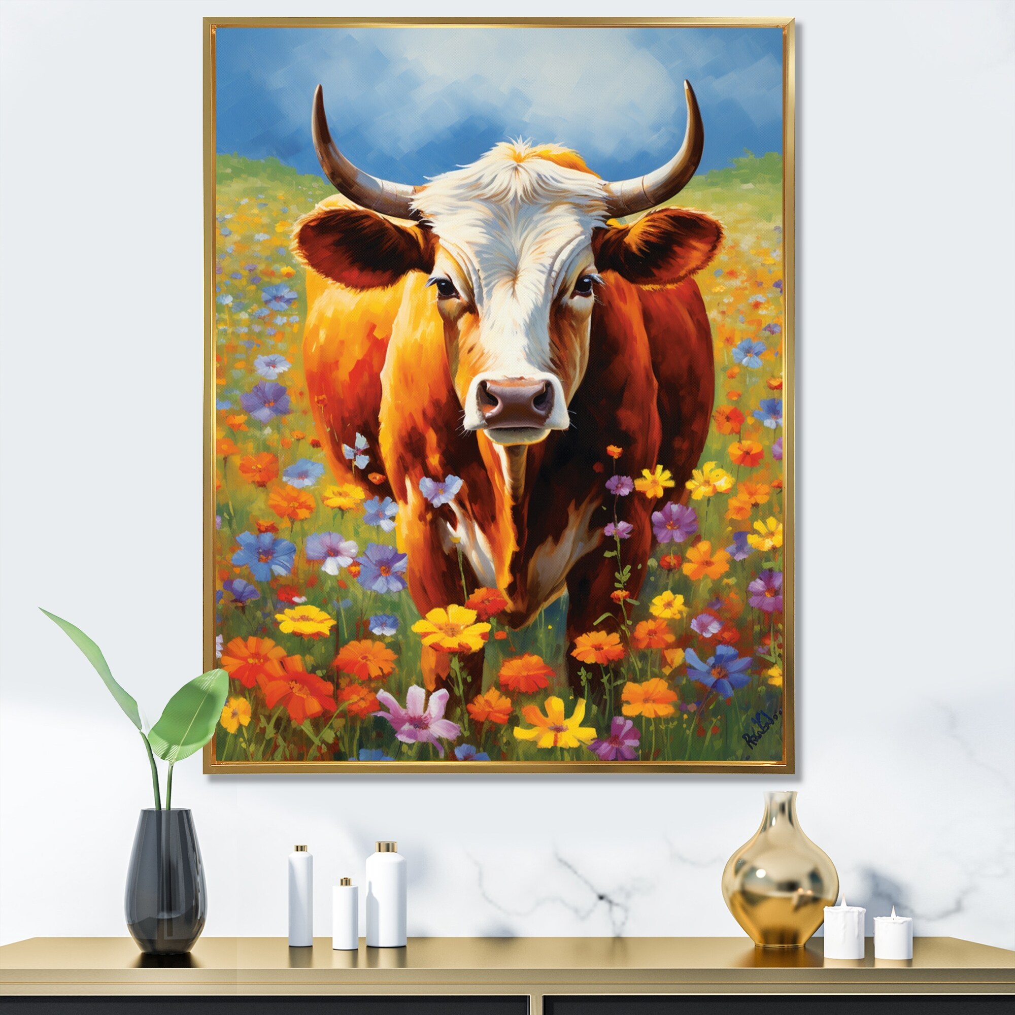 Designart "Cow In the Meadow V" Animals Cow Framed Canvas Art Print