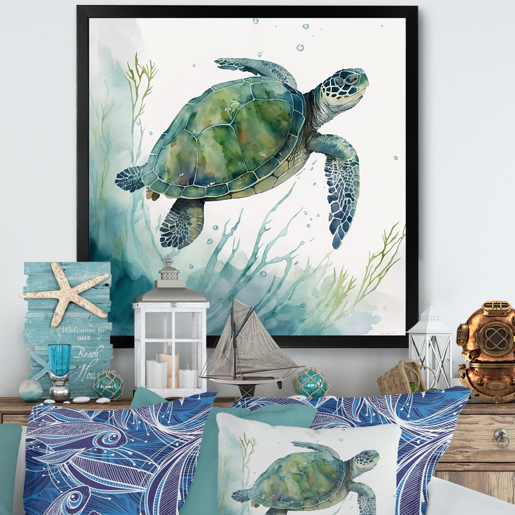 Designart "Watercolor Turtle Swimming II" Animals Turtle Framed Art Print