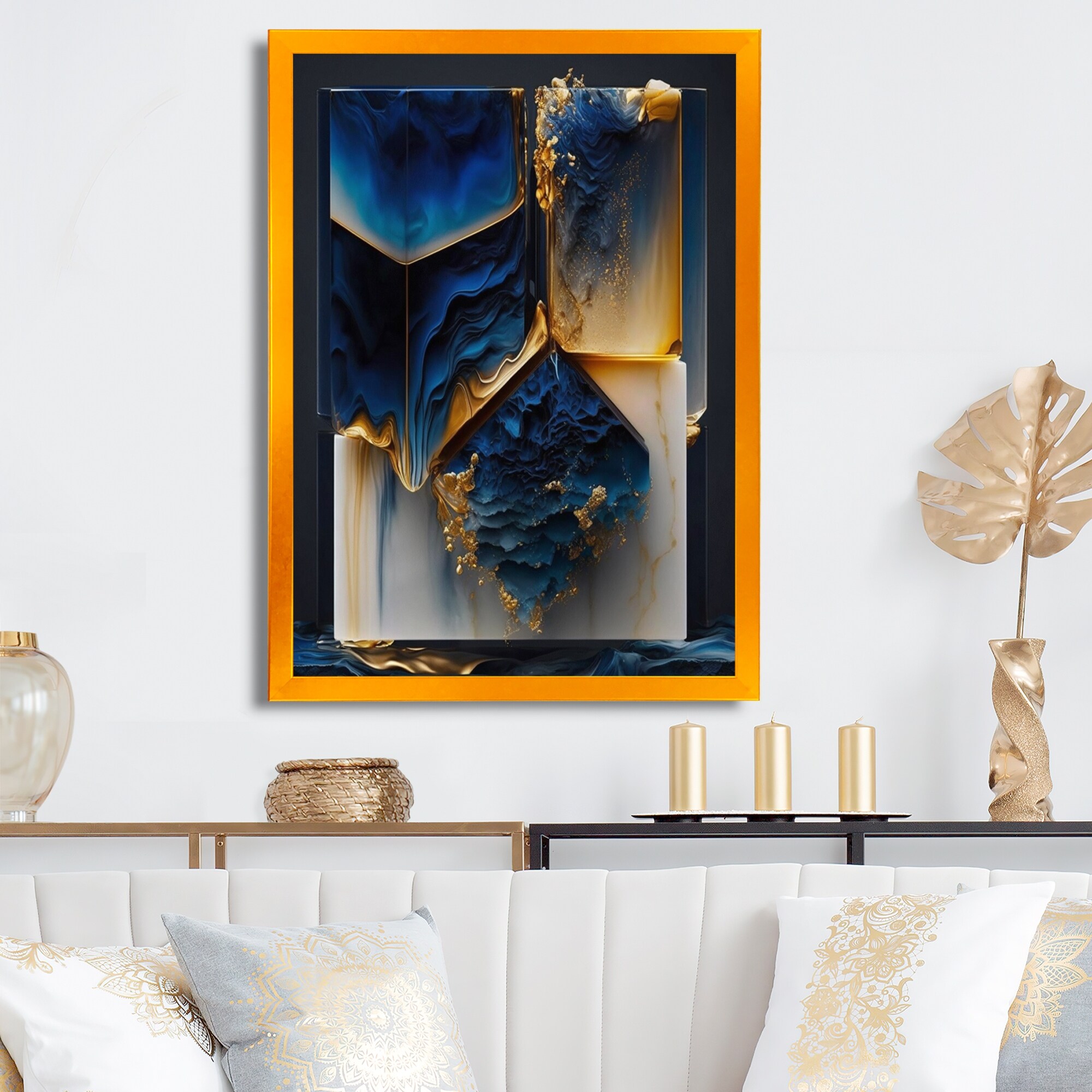 Designart "Abstract Geode Gold And Blue Marble Shape II" Animals Framed Art Print